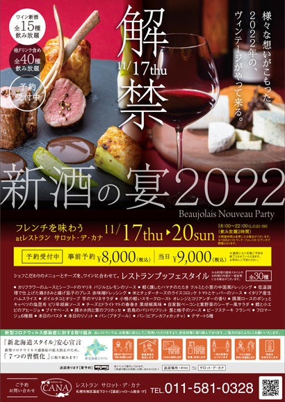 株式会社あいプラン(北海道札幌市/代表取締役・新道喜信)のレストランで、今年の新酒解禁を祝うイベント「新酒の宴2022」を開催いたします。例年人気のイベントで新酒15種を含む全40種のドリンクと、30種のお料理をブッフェ形式で心ゆくまでお楽しみいただけます。事前予約制となっておりますので、お早めにお申し込みください。