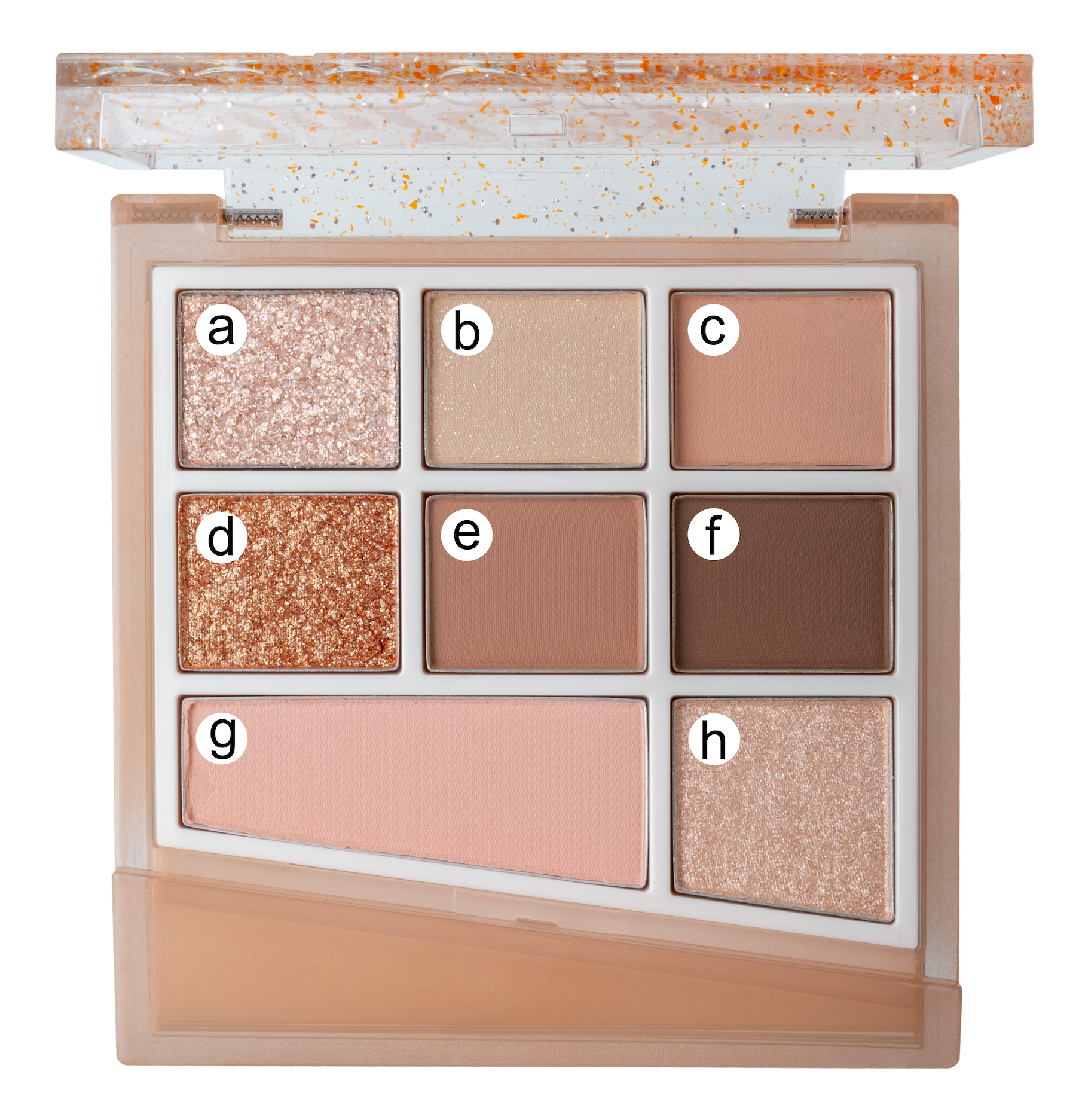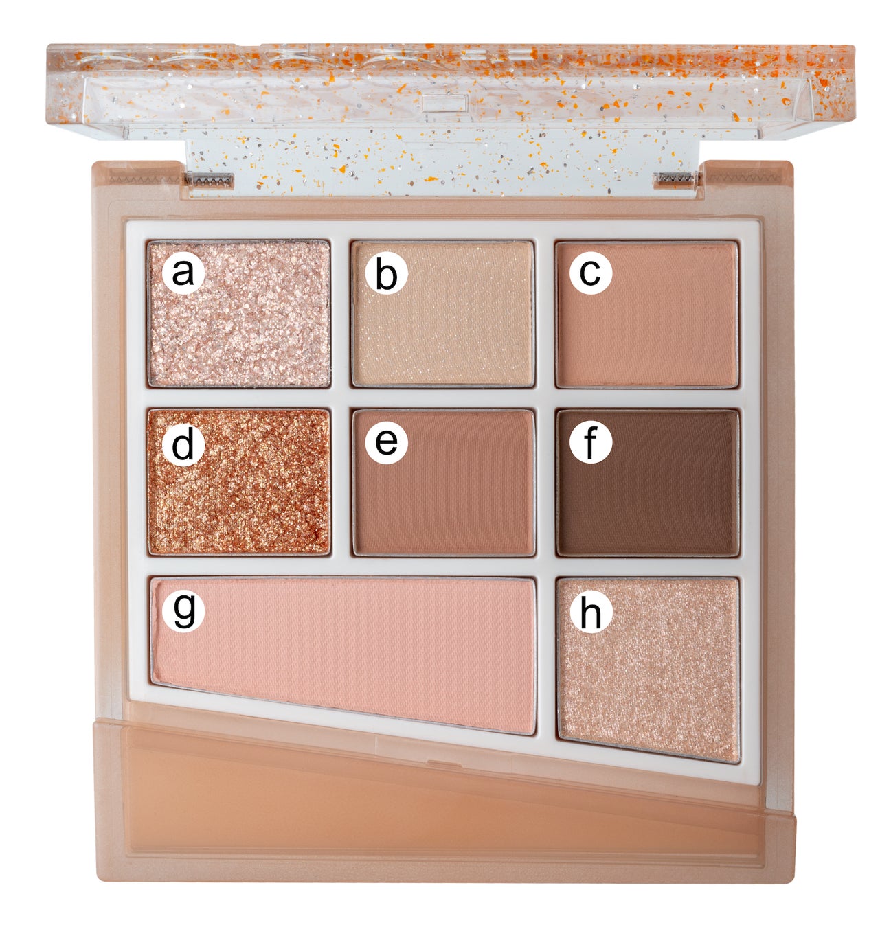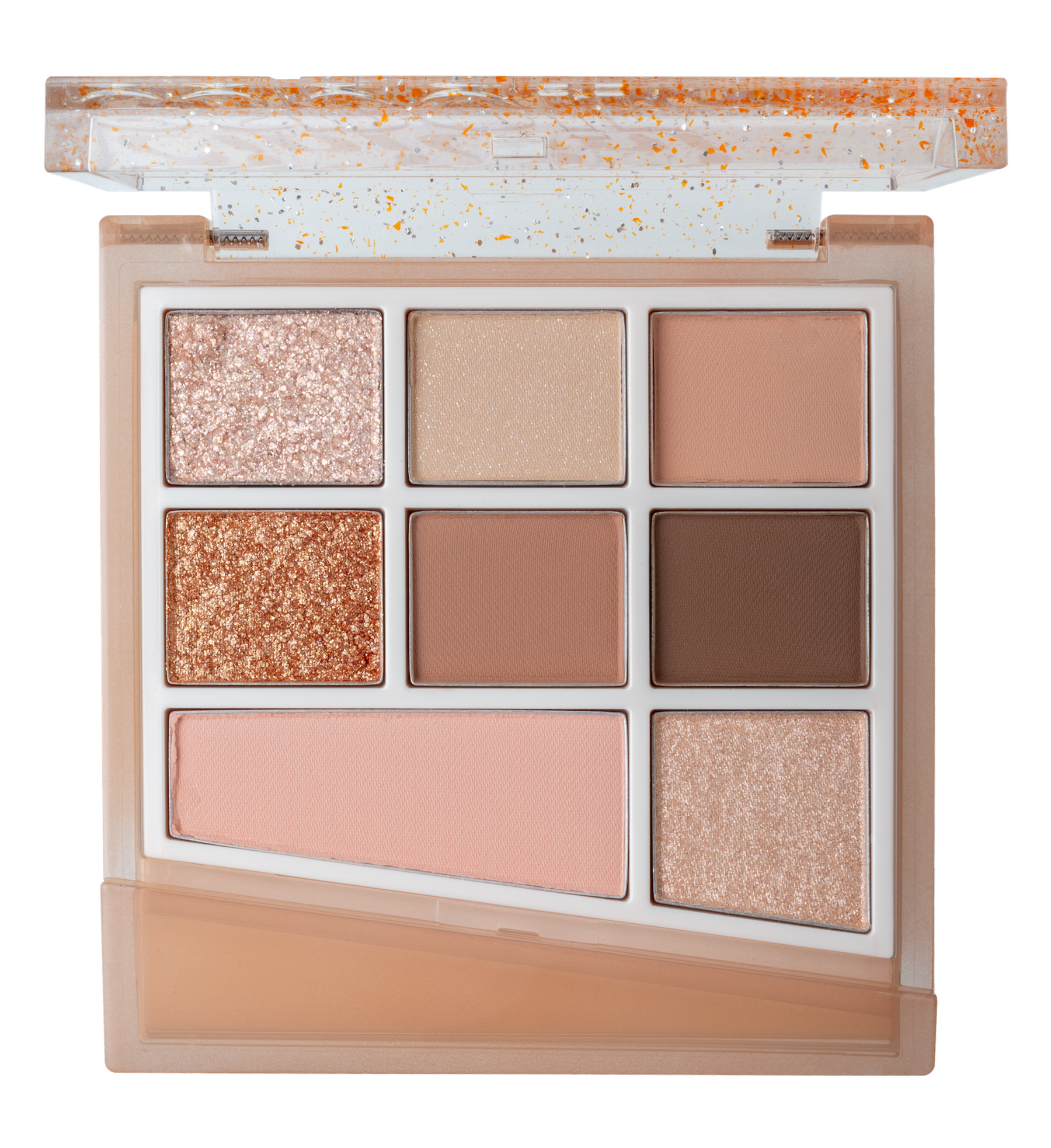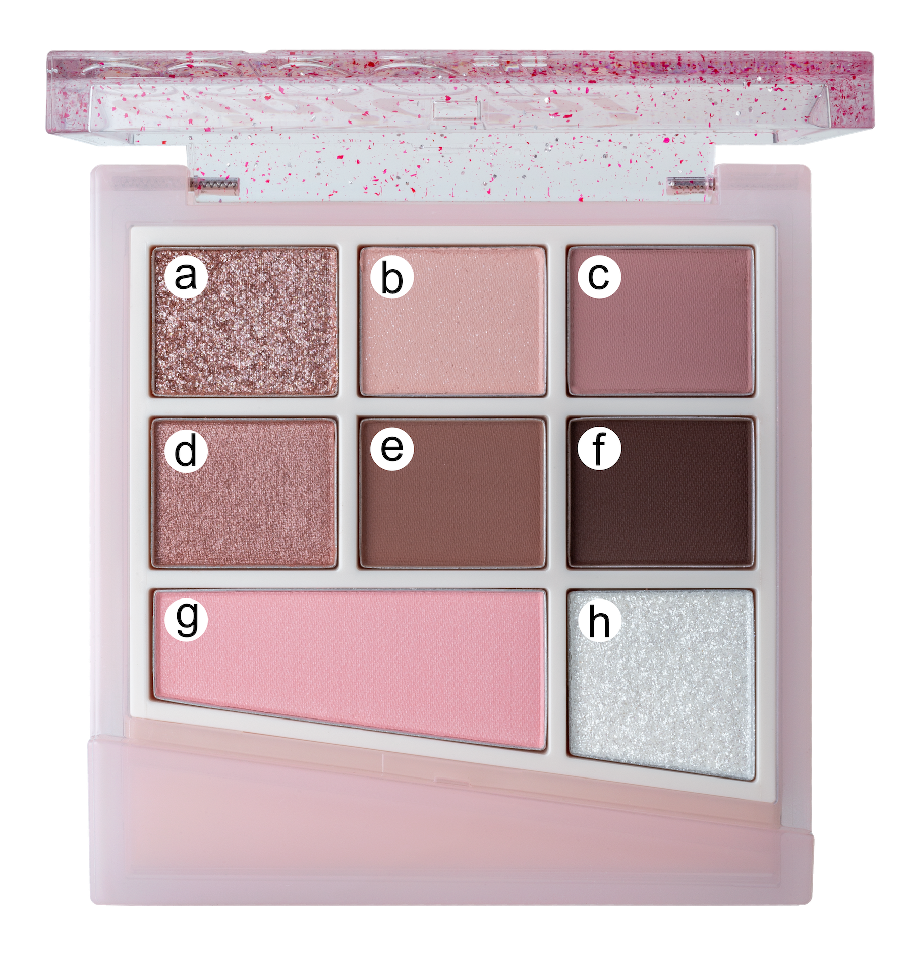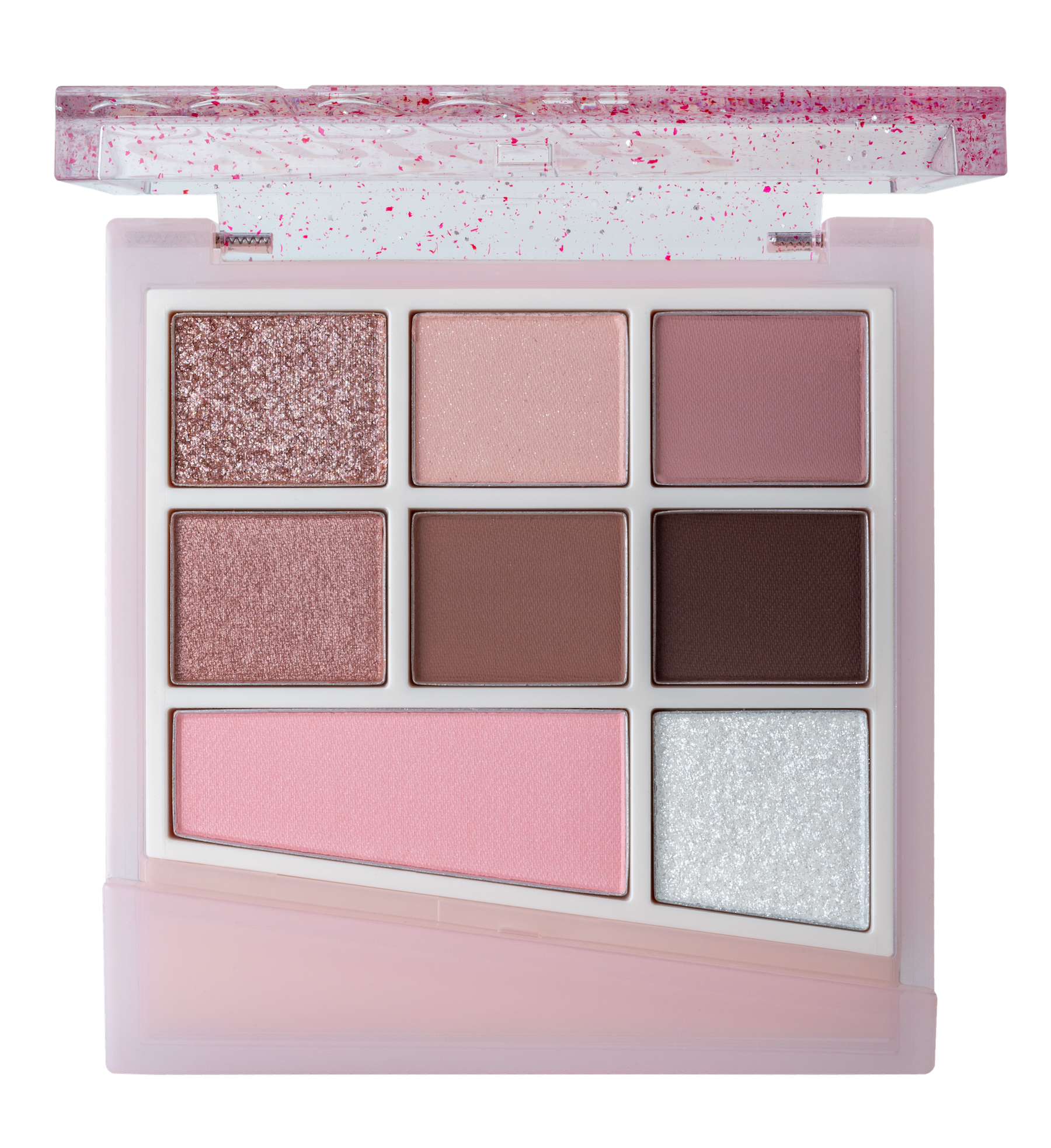 マット、シマー、グリッターと質感の異なるアイシャドウに、ブラッシャー(左下)、ハイライト(右下)を加えた活用度の高い構成。これ一つでカラーメイクが完成。