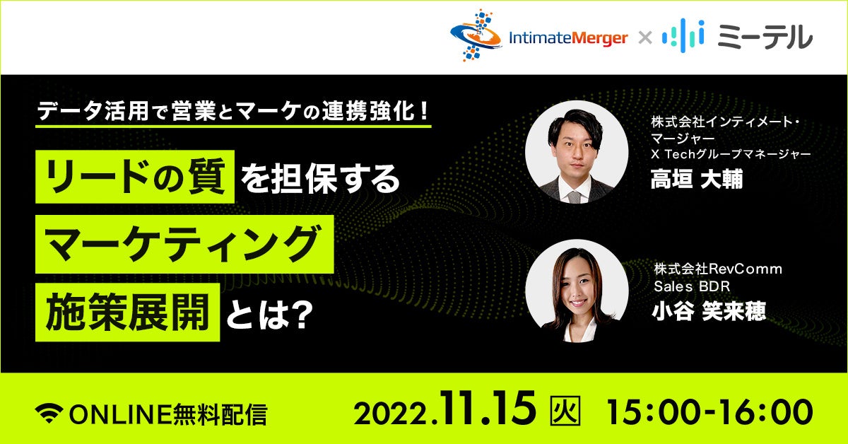 国内最大級パブリックDMPを提供するデータプラットフォームカンパニーの株式会社インティメート・マージャー(本社:東京都港区、代表取締役社長:簗島 亮次、以下当社)は、音声解析AI電話「MiiTel(ミーテル)」を提供する株式会社RevComm(本社:東京都渋谷区、代表取締役:會田武史、以下レブコム)と共催セミナー「データ活用で営業とマーケの連携強化!リードの質を担保するマーケティング施策展開とは?」を11月15日(火)15時より実施することをお知らせします。