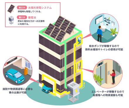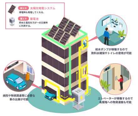 「マンション防災サービス」とは、既存マンションに初期費用ゼロ円で太陽光発電設備と蓄電池を設置し、停電発生時にマンション共用部の動力設備(給水ポンプ(水道やトイレ)、エレベーターや立体駐車場等)へ、発電・貯蓄した電気を供給できる仕組みを提供するサービスです。また、マンションの災害レジリエンスの強化のみならず、屋根の上に設置した太陽光発電設備に加え、実質再生可能エネルギー100%の電気を供給しながら蓄電池を有効利用することにより、マンション居住者の負担なく、建物を1棟丸ごと脱炭素化できてしまう仕組みも兼ね備えています。