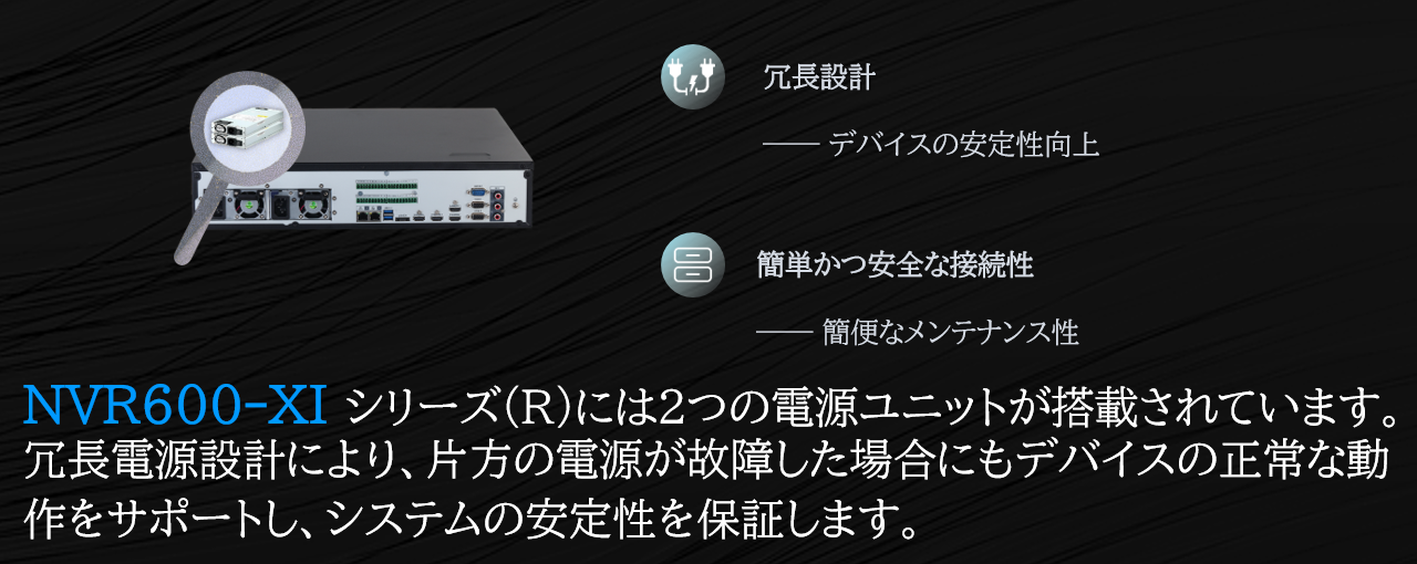 NVR600-XI シリーズは、これまで最もパワフルなNVRです。このNVRは、従来のビデオ管理とインテリジェント分析を統合し、最先端の自動化されたビデオ監視システムを提供します。内部の高性能ハードウェアは、より鮮明なディスプレイ出力、より高度なネットワーク帯域幅、よりインテリジェントな能力をもたらします。そして、より魅力的な機能を搭載します。4つの独立した HDMI出力、安定化二重電源、N+M のバックアップなど高性能AIチップは、高度なAI技術を搭載し、幅広い業種のニーズをカバーすることができます。