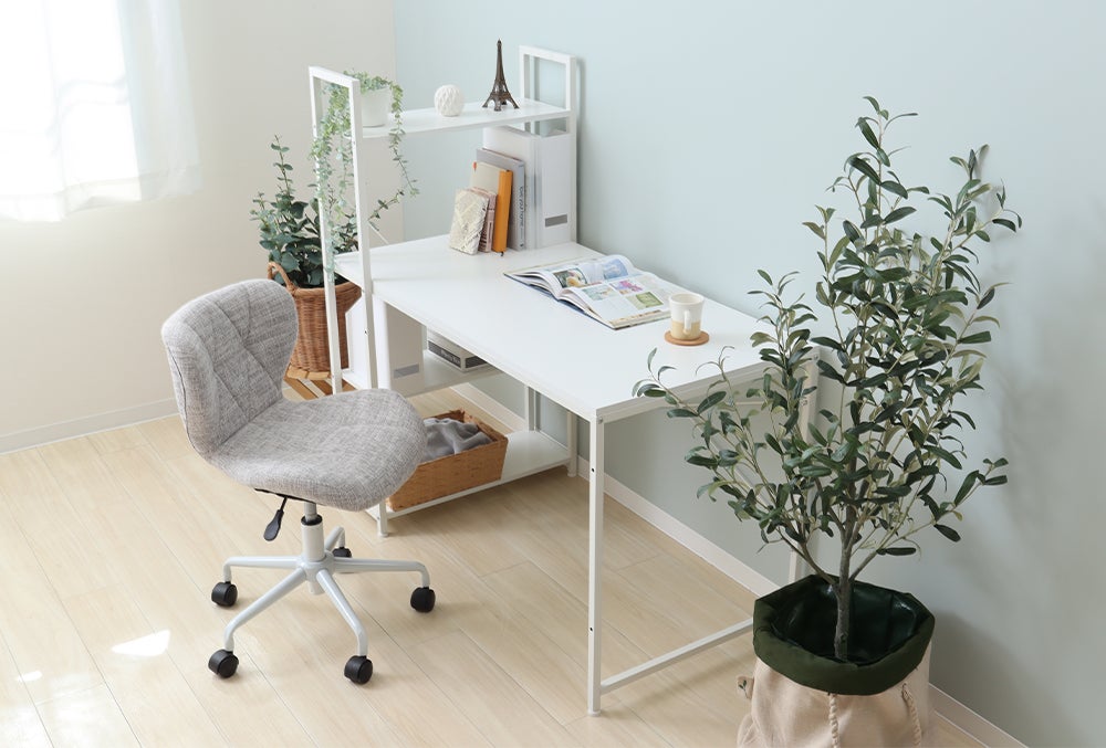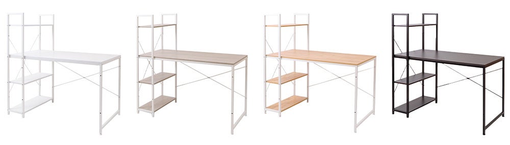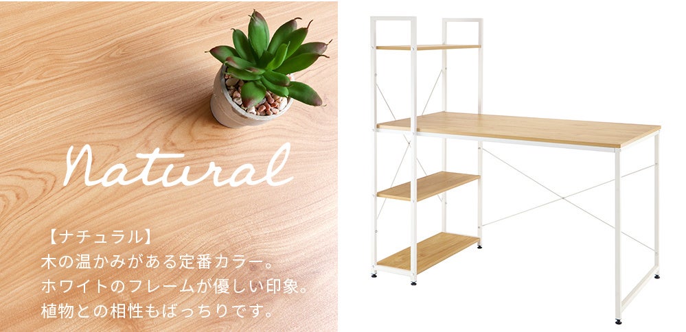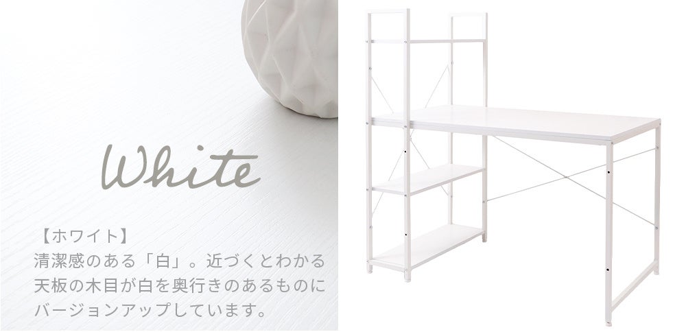 Rhetoric(レトリック)は、「スチールフレーム × 木目」といった異素材の組み合わせが人気のデスクです。これまで3色の木目(ナチュラル、アッシュ、ダークブラウン)の展開でしたが、新色として追加したのも「木目」の見える(ホワイト)カラーとなります。