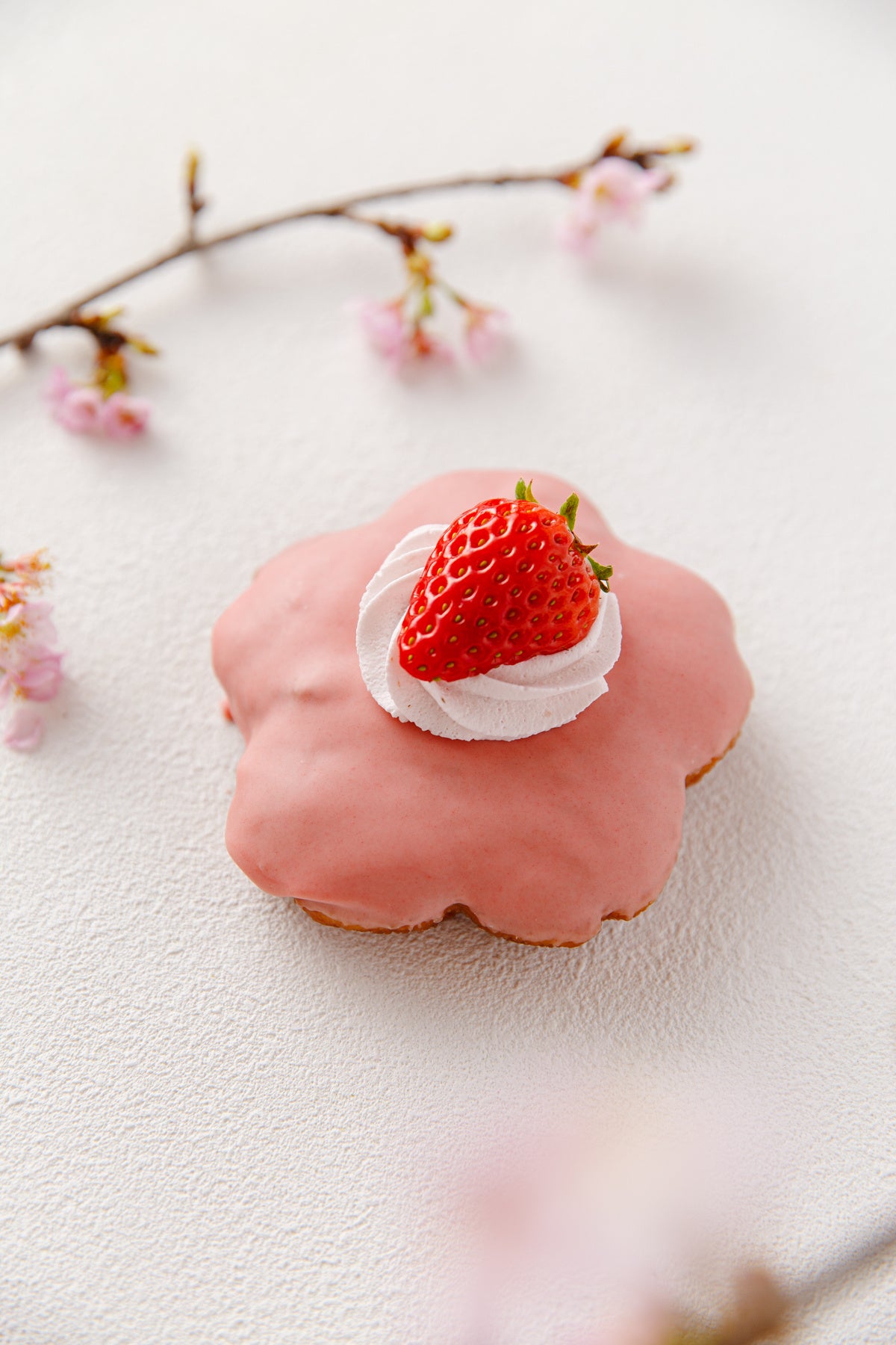 いちごチョコをコーティングした桜型ドーナツに、なめらかな苺クリームを絞り、仕上げにフレッシュ苺を丸ごとトッピング。ひとくち頬ばれば甘酸っぱい果実感が広がる、春の主役ドーナツです。