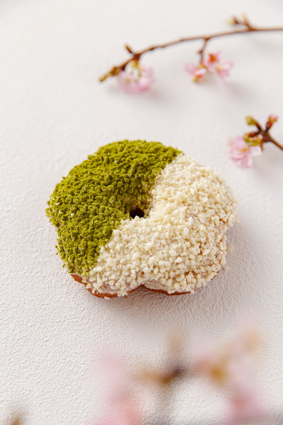 抹茶チョコをまとった桜型ドーナツに、マスカルポーネ入りの抹茶クリームをたっぷりと。抹茶の奥深い苦みとコクが溶け合う、大人のための贅沢な一品です。