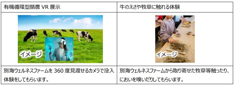 「未来に繋がるサステナブルな酪農VR 体験ツアー」は、SDGsと酪農への理解を深める体験型スペースです。VR技術を活用し、都市部にいながらにして本格的な酪農体験ができる画期的な取り組みです。有機循環型酪農VRツアーでは、実際に牧場にいるかのような臨場感あふれる体験を通じて、持続可能な酪農のプロセスを仮想空間で学べます。更に、別海ウェルネスファームから取り寄せた牛のえさにも触れることで、酪農への理解を深め、より身近に感じてもらえるバーチャルとリアルを融合したコンテンツに仕上げています。