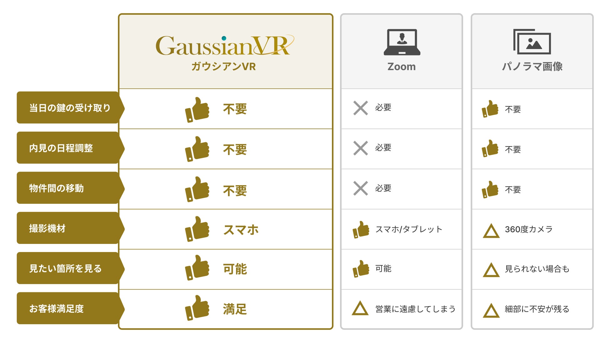 これまでの不動産内見VRでは、パノラマ画像の繋ぎ合わせが主流で「数メートル間隔の点移動」し かできない制約がありました。【ガウシアンVR】では[Gaussian Splatting]の技術を活用して、物 件を空間丸ごと3Dで構築し、室内を自由に歩いて内見できます。しかも、専用機材が不要で、一般 のスマートフォンの動画撮影だけで完了する、画期的なソリューションです。動画をアップロード して最短数十分でAIが自動生成します。
