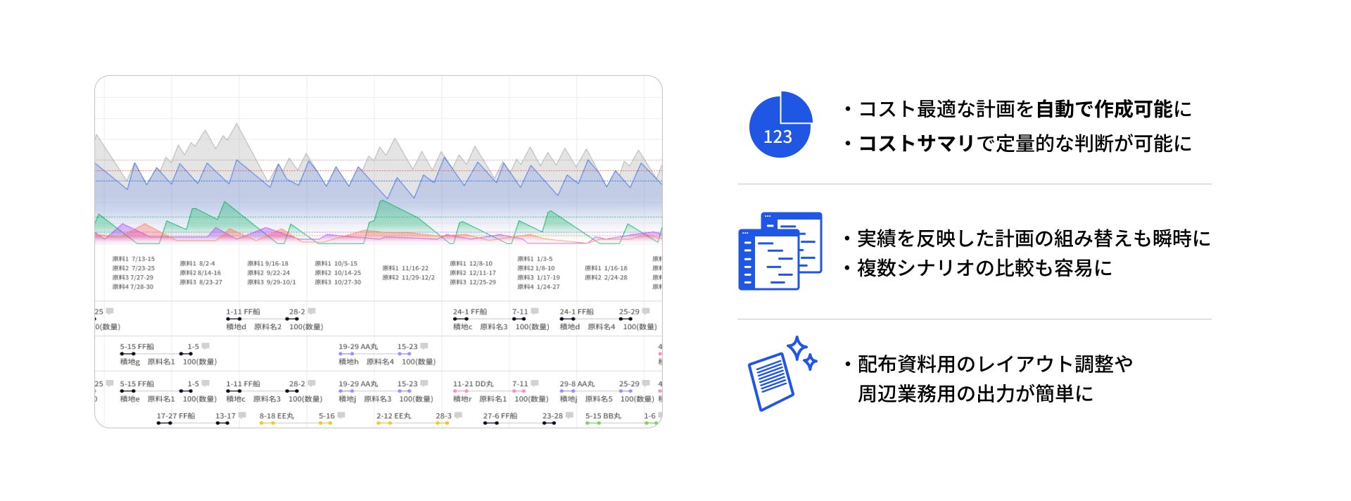 配船の動静や消費シナリオの変化に応じて瞬時に計画修正が可能