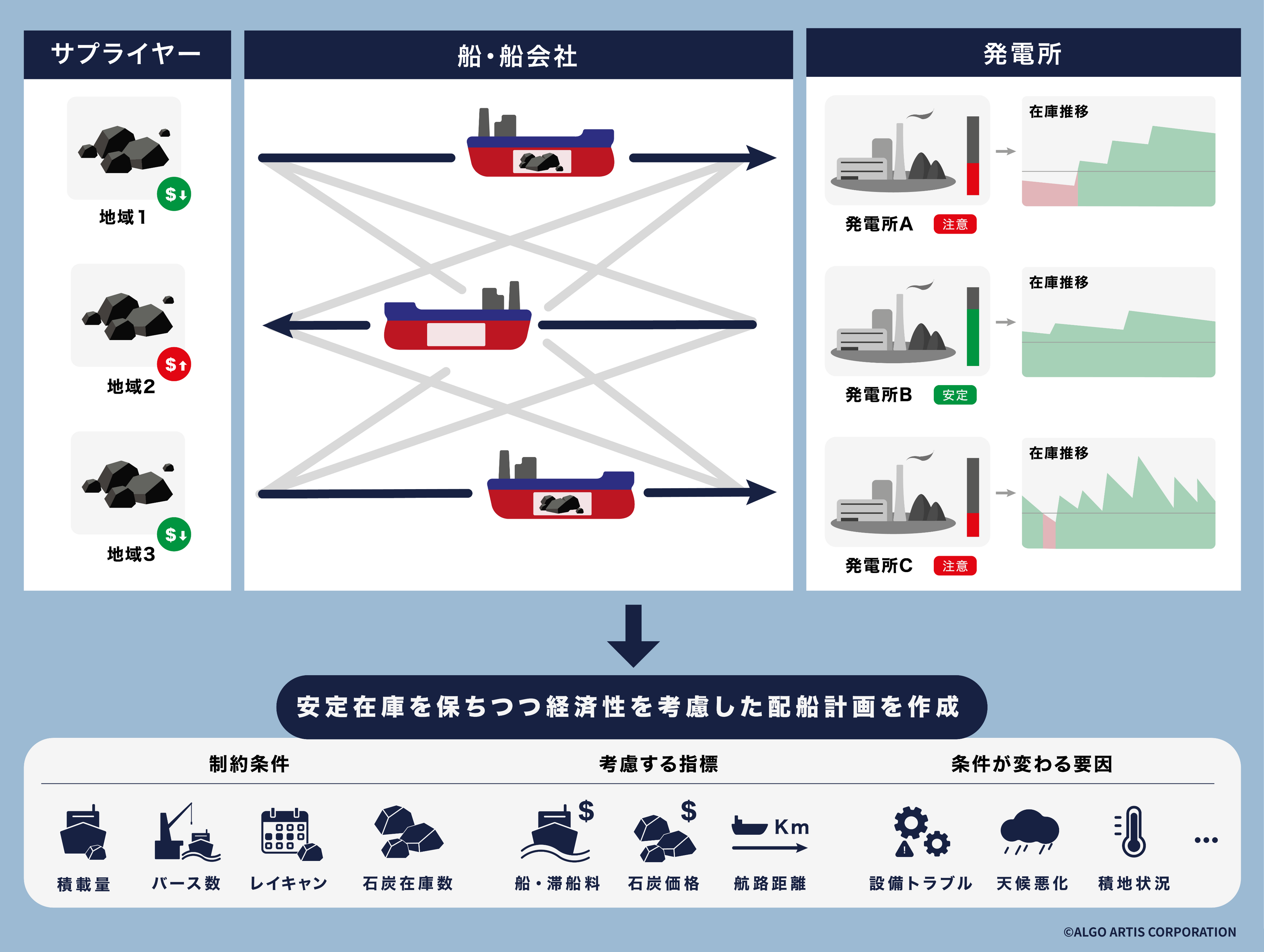 ALGO ARTISは同社の経験・ノウハウや実務上の複雑な運用ルールを反映したオーダーメイドのアルゴリズムと、専用のユーザインターフェースを開発。石炭代や運賃などのコストを最小化しながら、船の動静や発電所の石炭消費シナリオの変化に対応した最適な配船計画を自動で策定することで、より経済的な石炭調達に貢献してまいります。