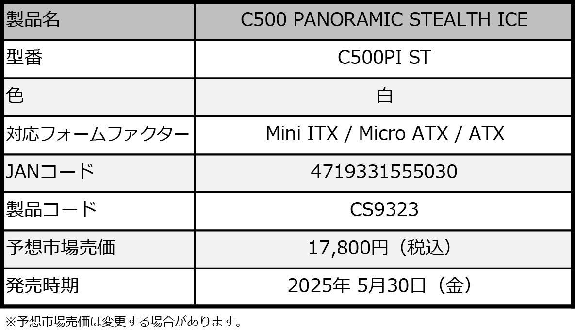 ピラーレスデザインのPCケース「C500 PANORAMIC STEALTH ICE」を2025 年5 月30 日(金)に発売いたします。