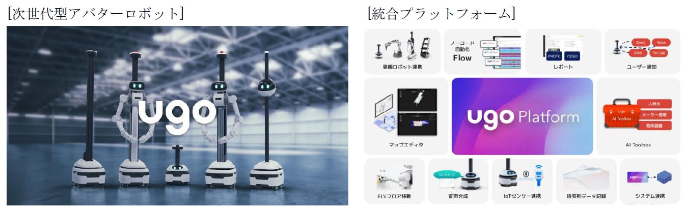 ugo社は「人とロボットの融合で、新しいワークスタイルを提供する」をミッションに掲げ、次世代型アバターロボットと、各種ロボットを統合するプラットフォームの開発を通じて、「ロボットが社会の一部としてごく普通に存在し、人と共に仕事をしている世界」すなわち「ロボットの社会実装」を目指しています。