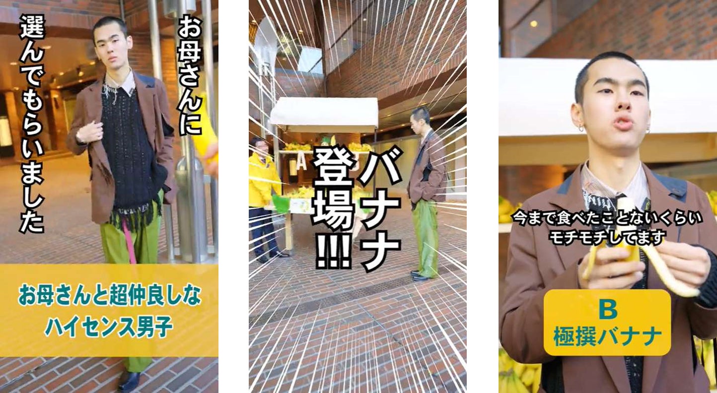 5月9日から、合計5本の動画コンテンツを公開いたします。動画では、幅広い層の方に一般のバナナと『Dole極撰バナナ』を比較していただき、「どちらがおいしいか」の生の声をお聞きする内容となっております。
