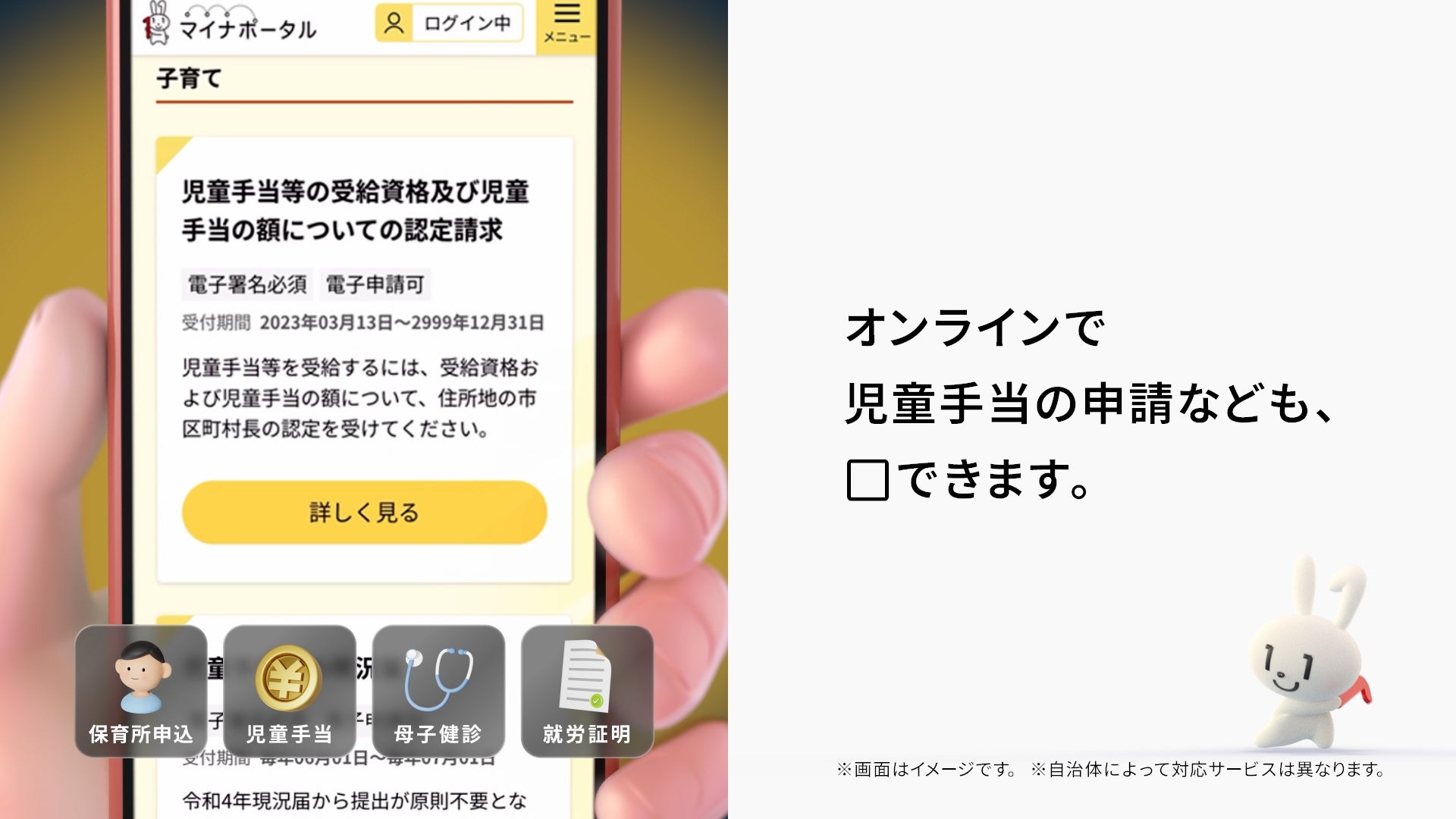 「子どもを連れて役所に行くのは大変……。」 そんな時、マイナポータルから児童手当の申請や保育所申込、妊娠の届出など子育てに関する手続きが24時間オンラインでできます。