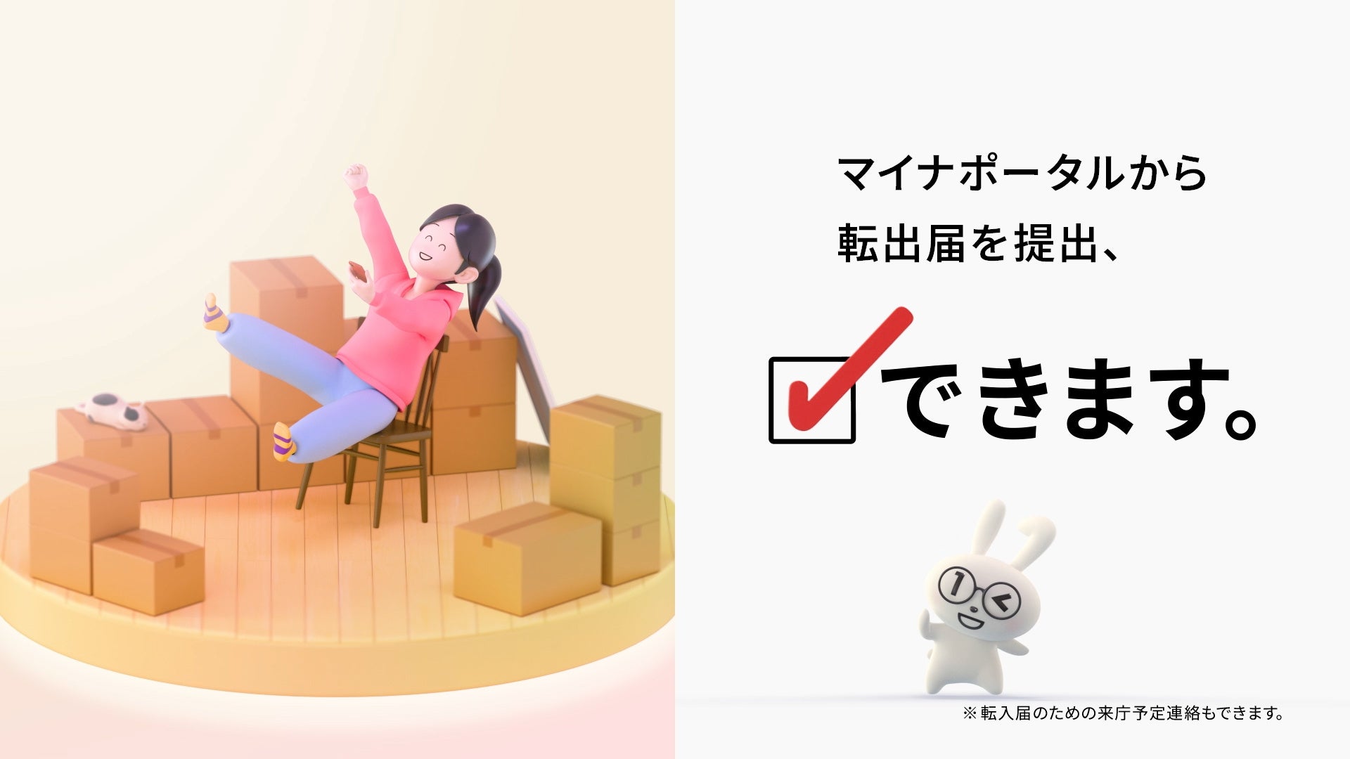 引越しは荷造りや荷解き、掃除、各所への住所変更届など、やることがたくさんあります。そうした中、これまで転出届の手続きは役所に行く必要がありましたが、マイナポータルを使えばオンラインで提出できます。また、転入先への転入届の来庁予定の連絡もできます。