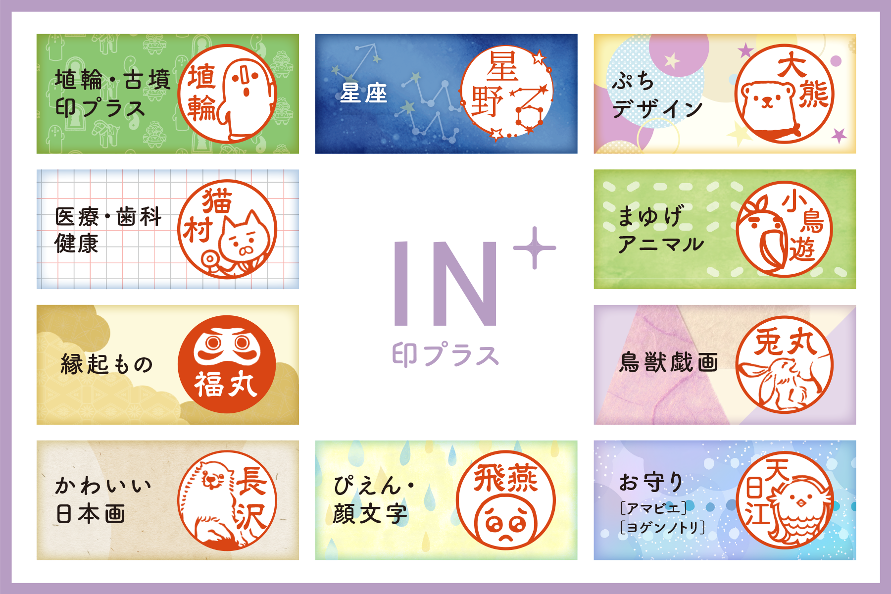 2019年にリリースされた、当店オリジナルのイラスト入り印鑑「印プラス」。2023年10月31日(火)に、ユーモア溢れるハニワや勾玉、土偶のイラストが入った「古墳・埴輪」シリーズがリリースしました。他に、縁起もの、鳥獣戯画、まゆげアニマル、星座、顔文字、医療・歯科、かわいい日本画の、全10シリーズを展開しています。