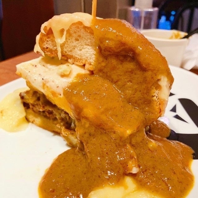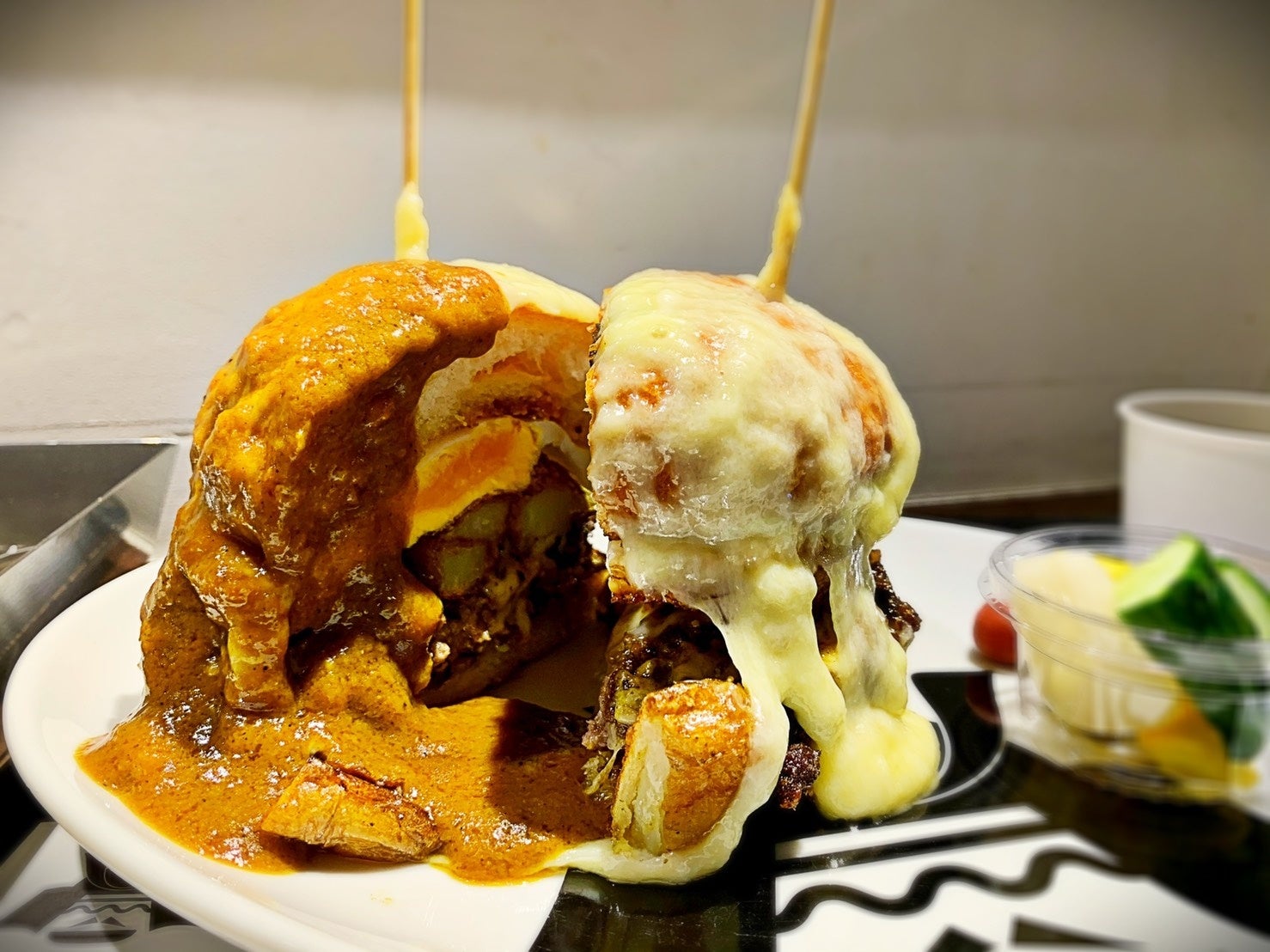 肉とカレーのたまらなく香ばしい香りは、日本人なら思わず唾を飲んでしまうような食材を1つにした、欲望を満たすカレ ーまみれの新感覚グルメバーガーです。
