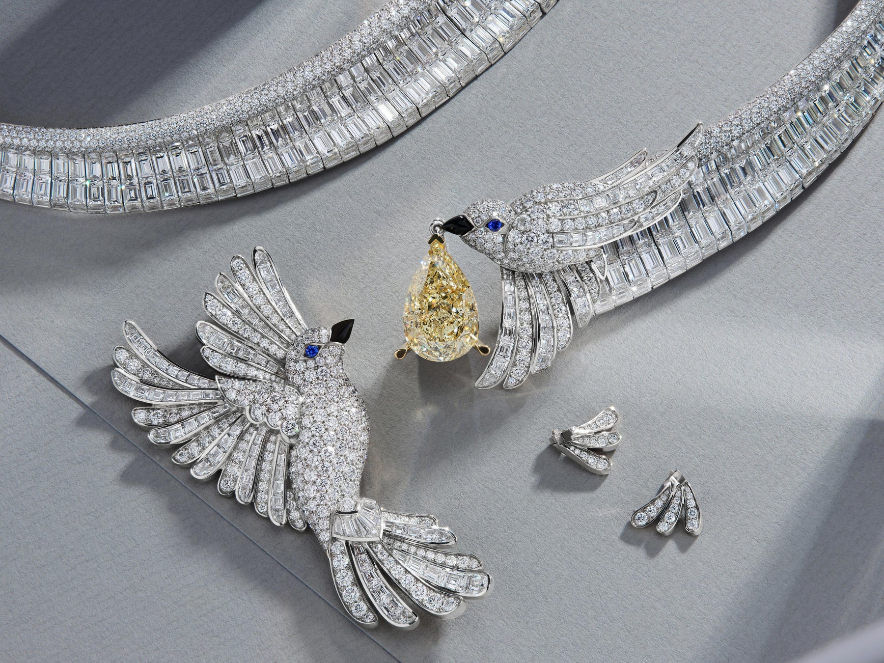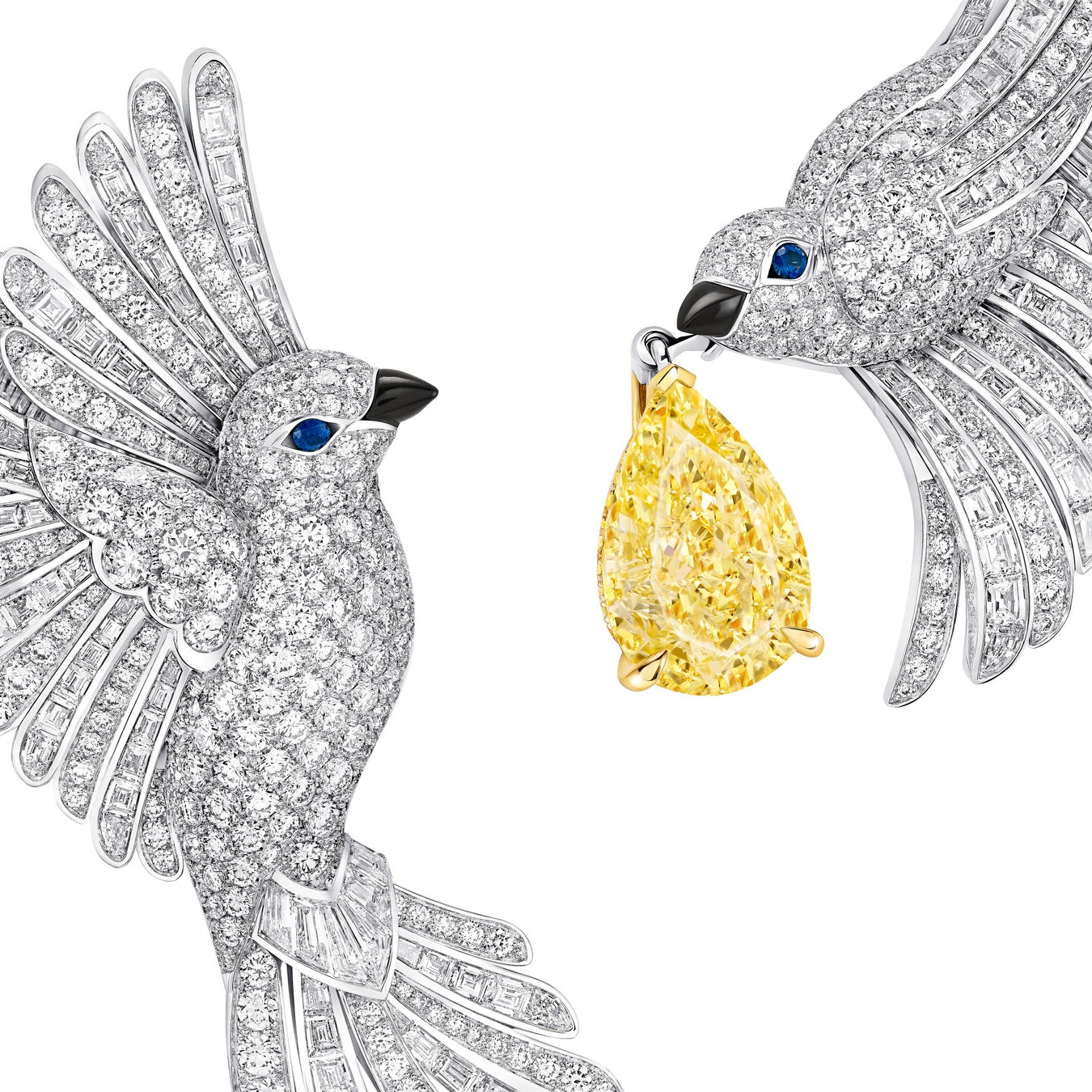 丁寧にカスタムカットされたバゲットカットダイヤモンドが印象的な輝きを放つネックレスは、構築的でありながらも鳥のフェザーを思わせる有機的なフォルムを描き、その優美なシルエットは自然界の美しさを称えています。美しいブルーサファイアの瞳と漆黒のオニキスのくちばしで彩られた2羽のスパロウは、ネックレスの中央に向かい合うように配置され、ダイヤモンドの翼を広げ優美に舞い上がる1羽に、エレガントに佇むもう1羽が愛の贈り物 -ギフト オブ ラブ- である13.51カラット ファンシーインテンスイエロー ペアシェイプダイヤモンドを贈る姿が描かれています。
