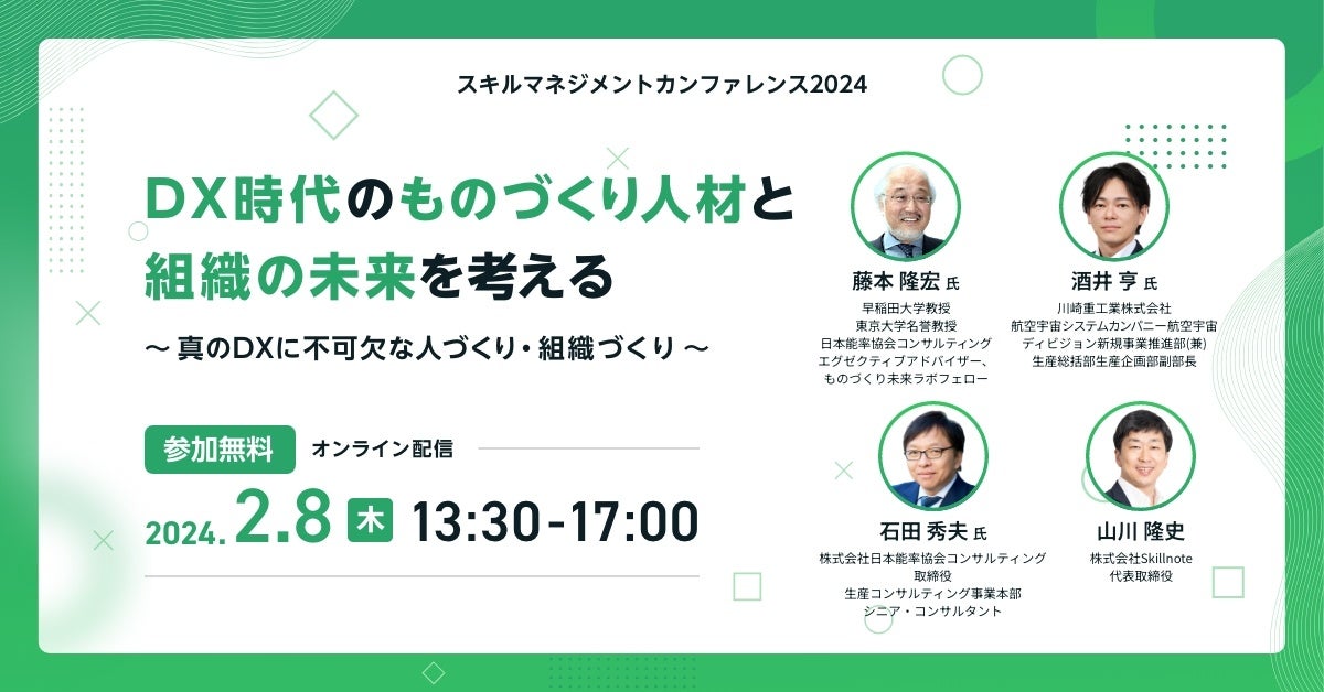 製造業のスキルマネジメントを牽引する株式会社Skillnote(本社 東京都千代田区、代表取締役 山川隆史、以下Skillnote)は、株式会社日本能率協会コンサルティング(本社 東京都港区、代表取締役社長 小澤勇夫、以下JMAC)協力のもと、日本初の製造業スキルマネジメントに関するカンファレンス『スキルマネジメントカンファレンス2024 ~DX時代のものづくり人材と組織の未来を考える~』を2024年2月8日(木)にオンラインにて開催いたします。