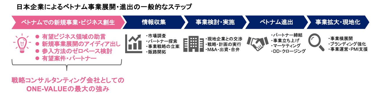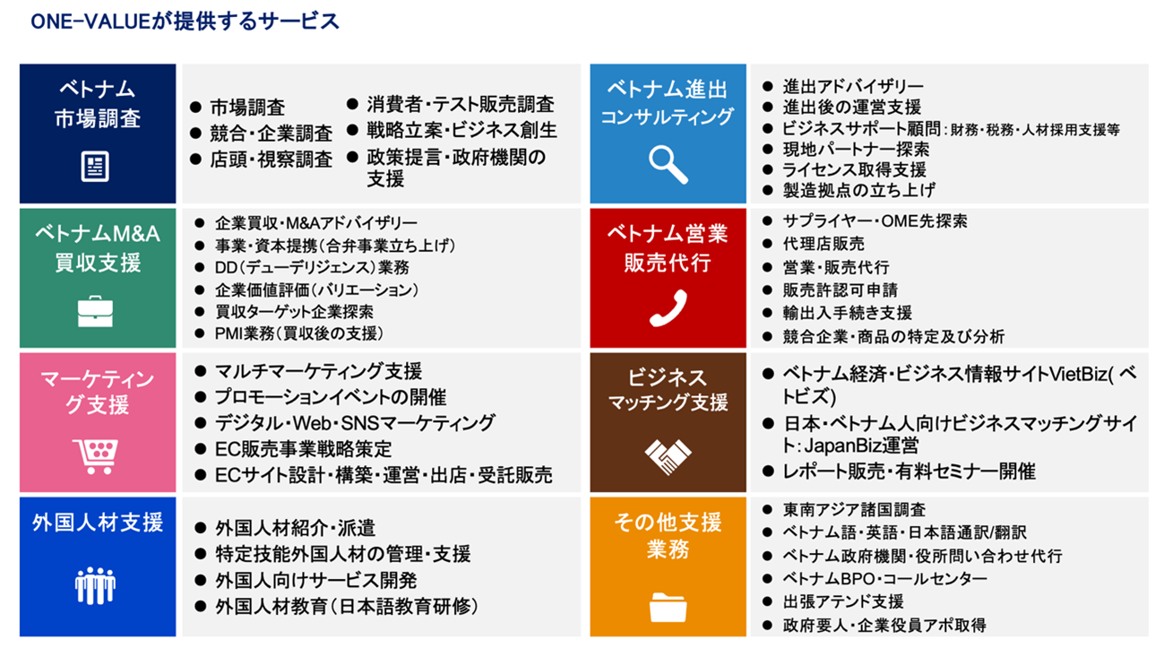 ONE-VALUE株式会社は、日本企業の東南アジア・ベトナムでのビジネスを支援する会社です。ベトナム・東南アジアでのビジネスをする日本企業を支援する多数の支援メニューを提供しています。