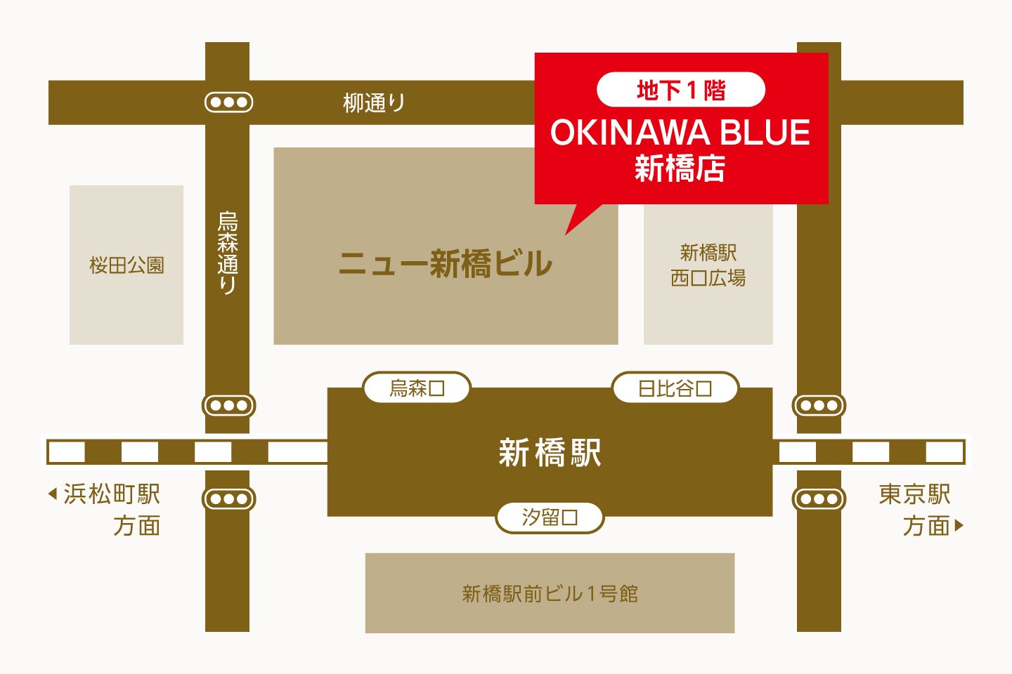 4店舗目となる直営店舗「OKINAWA BLUE 新橋店」は、サラリーマンの街として知られる新橋に位置するニュー新橋ビルに出店。ニュー新橋ビルは、新橋駅徒歩1分、SL広場に面した大型複合ビルで、1971年の開館以来、サラリーマンの聖地として多くの人々に親しまれてきました。昭和の風情が残る情緒ある複合ビルで、郵便局や各種商店のほか、居酒屋や喫茶店など数多くの飲食店が軒を連ねています。