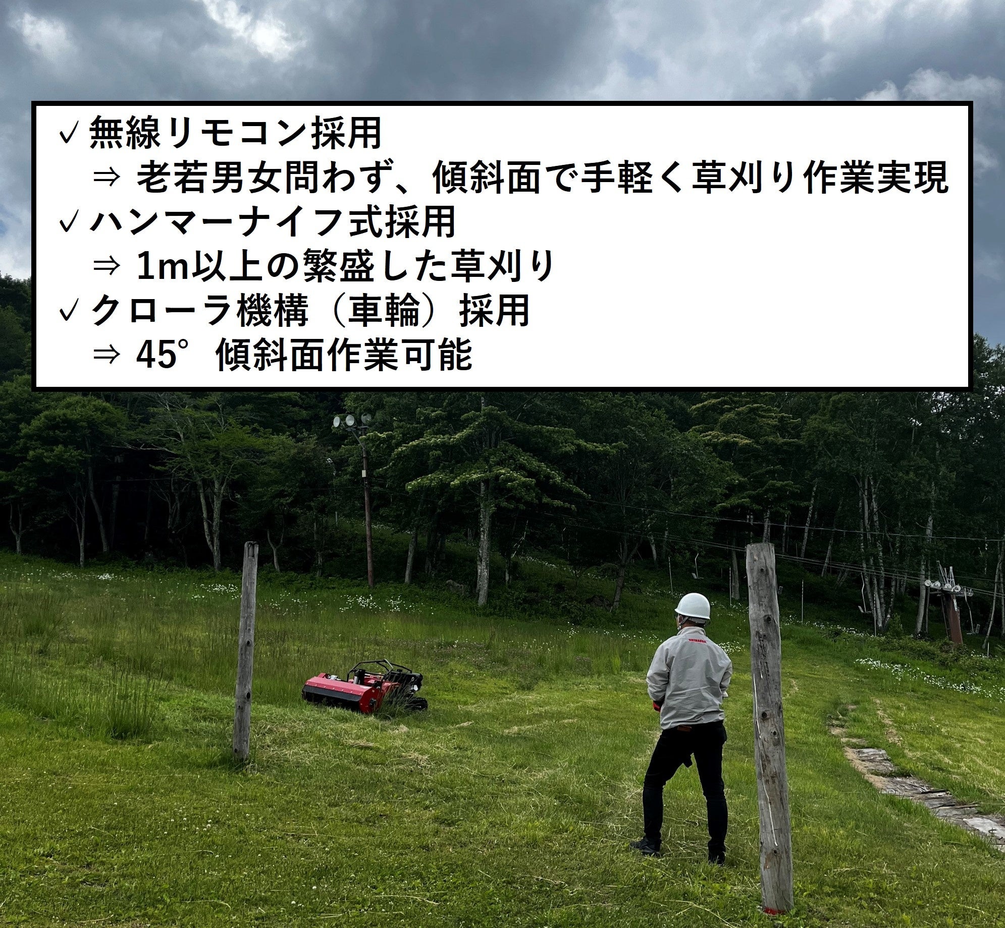 術成果を使用したもので、プロユース仕様の機能を有した製品です。リモコン操作で、1m を超える雑草の繁茂