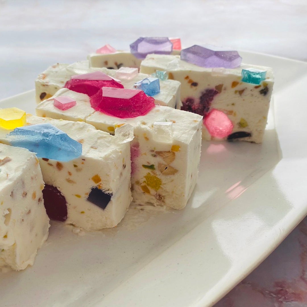 2月の誕生石である、 紫色のグラデーションが神秘的な美しい『アメシスト』の原石や、研磨すると猫の目のような光の筋が浮かぶことがその名の由来といわれる『クリソベリルキャッツアイ』を手切りの寒天菓子【琥珀糖】で表現しました。