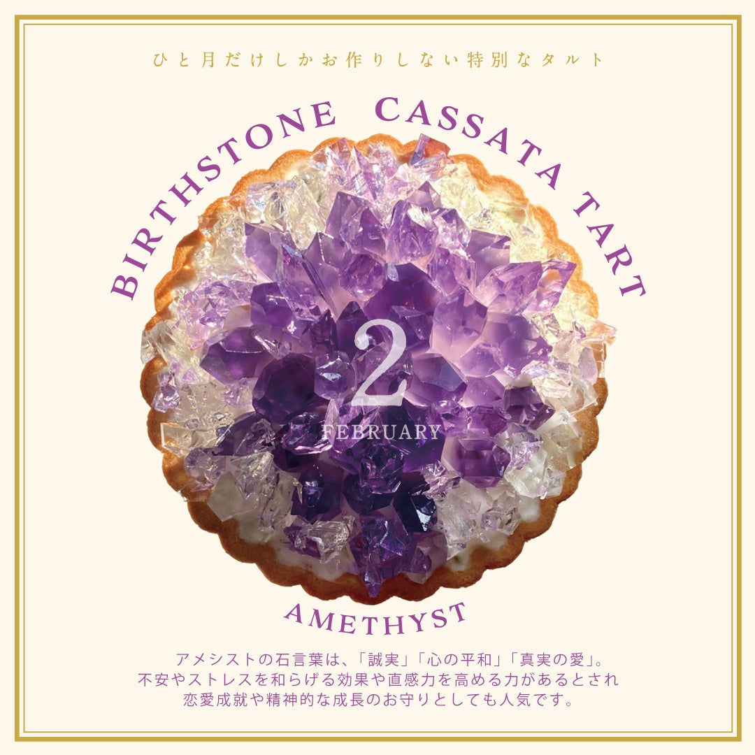 ひとつひとつ職人が切り出す鉱物のような琥珀糖の切りたての輝きをお楽しみいただける特別な誕生石のタルトに、2月限定バージョンが登場。