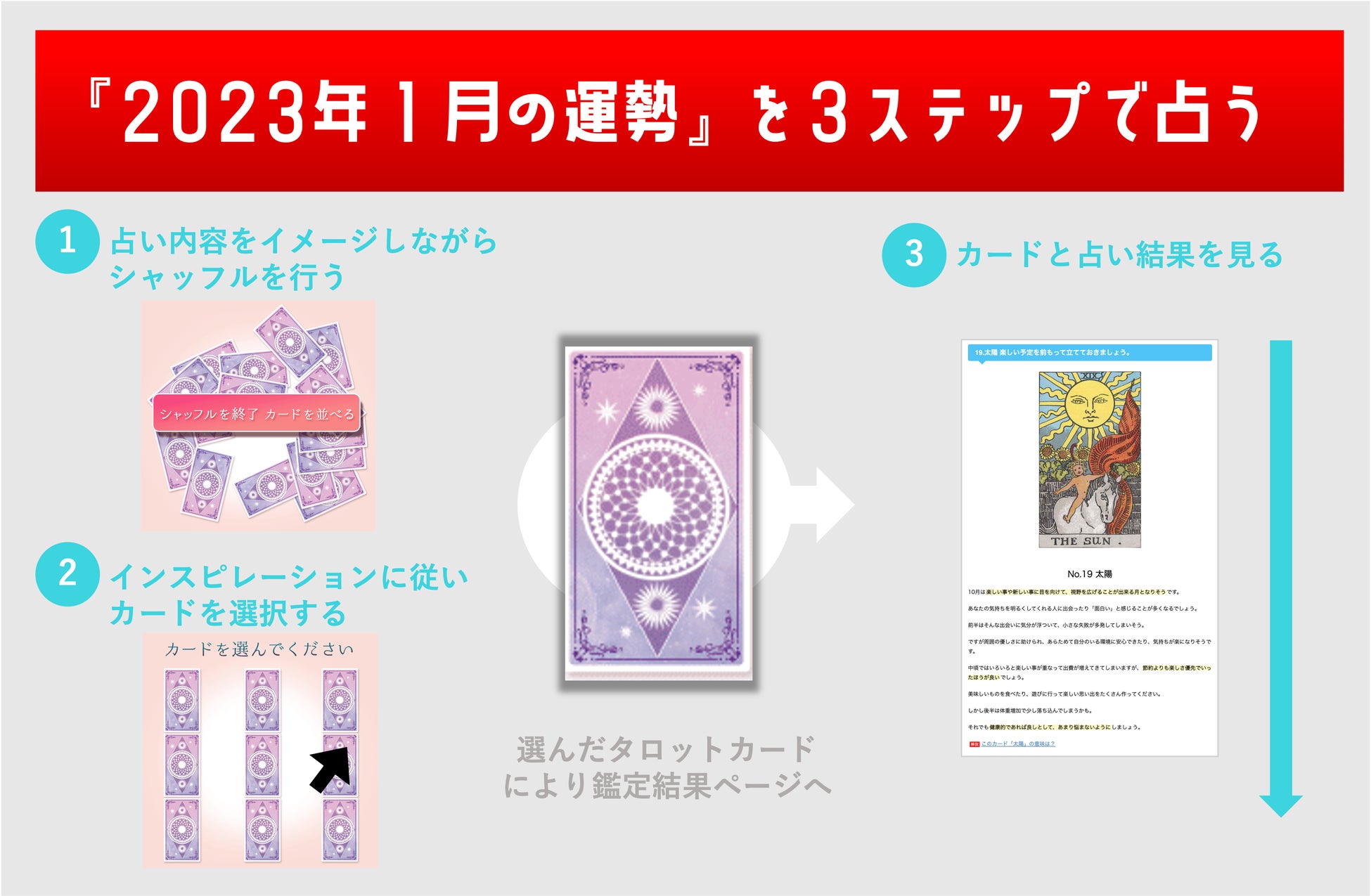 利用者は、1月の運勢をタロット占い機能により占うことができます。このタロット占いはワンオラクル方式(1枚引き)で行い、シャッフル後に展開された9枚のなかからインスピレーションを得た1枚を選ぶことで占うことができます。