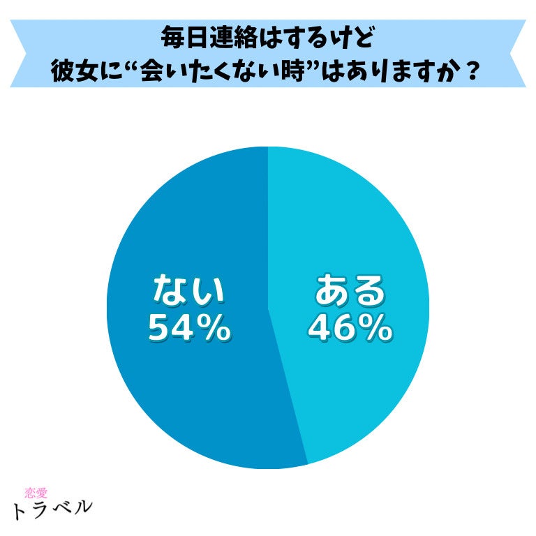 全国の20代〜50代の男性100名に彼女に連絡は返すけど“会いたくない”と思ったことがあるか、アンケートを取った結果46%の男性が経験したことが『ある』と回答しました。