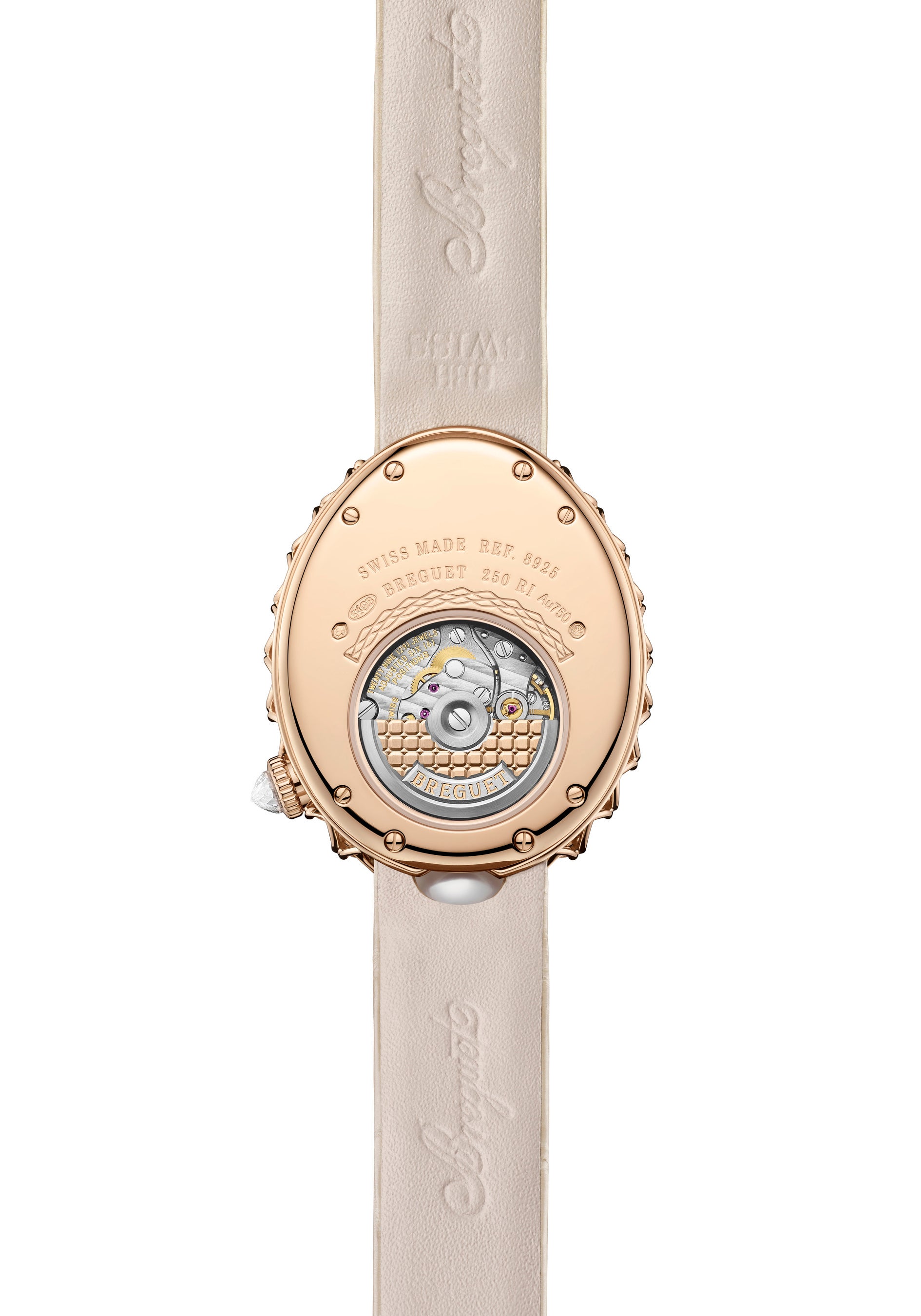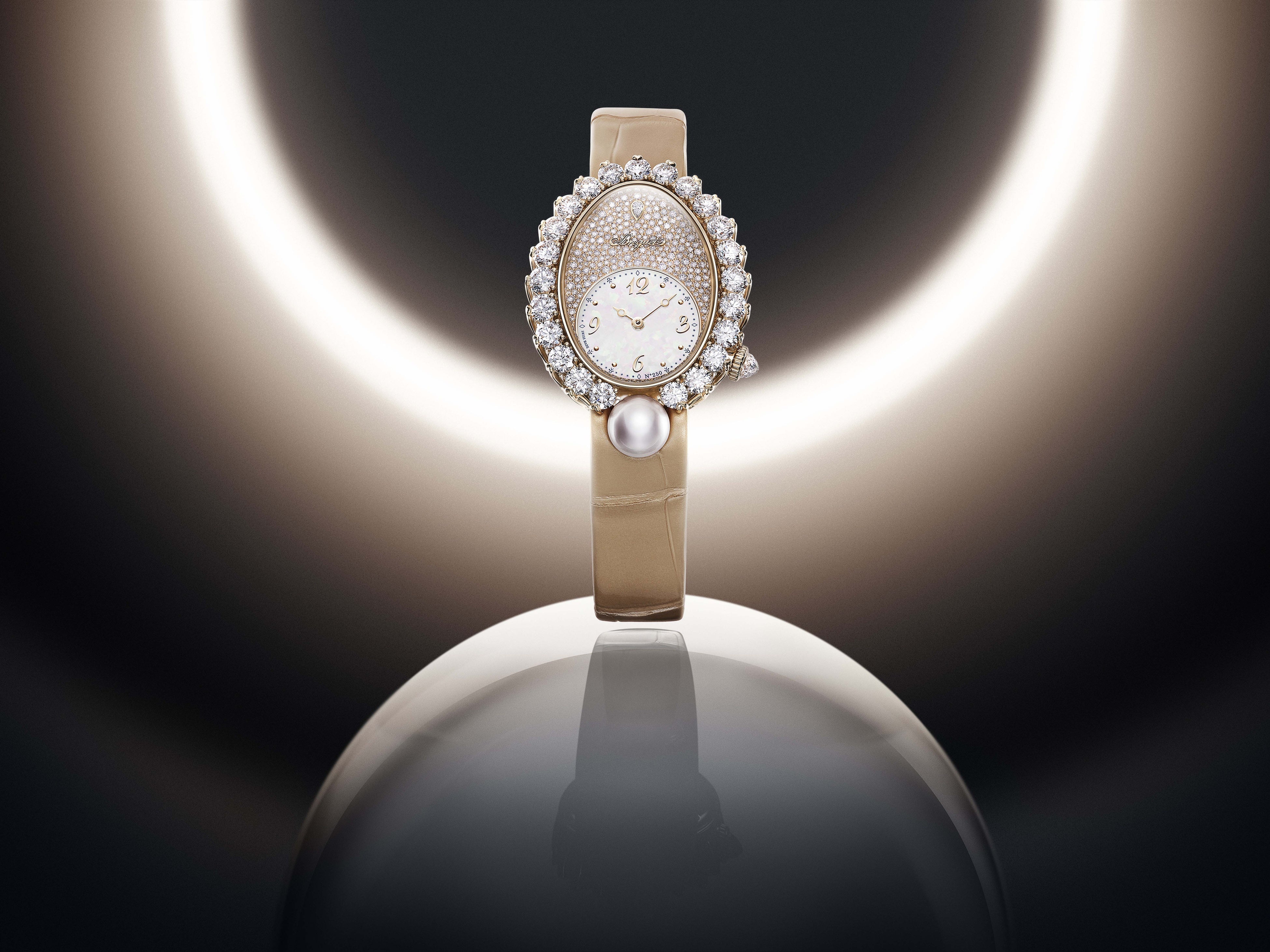 ケースの6時側では、完全な球形のアコヤパールが楕円のケースに応えます。丸い形のアタッチメントは「レーヌ・ドゥ・ナープル」の美しいデザインの特徴として有名ですが、ここではアコヤパールがそれを演じています。ソフトでセンシュアルなアコヤパールは、その繊細な虹彩をもってベゼルの一部に成す一方で、ブレゲゴールドを用いた初のブレスレットにも広がり、ブレスレットの中央列をまさにアコヤパールが構成しているのです。相対するそれぞれ2列のリンクはブレゲゴールドで作られています。素材とコントラストが手首に華やぎをもたらすパールとゴールドを橋渡しするのは、しなやかにリンクが連結するブレスレット構造です。また、サテン調の加工を施したシャンパンカラーのアリゲーターレザーストラップを組み合わせたモデルもあります。