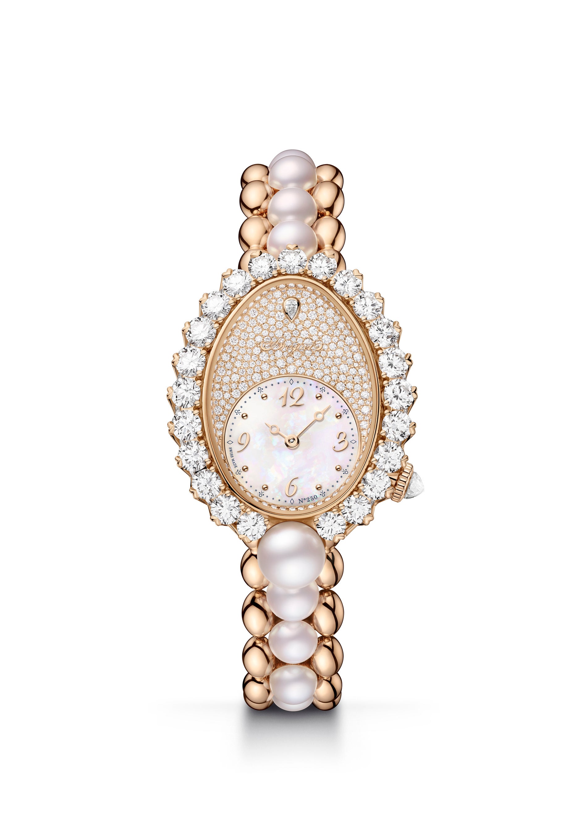 「レーヌ・ドゥ・ナープル」は、ブレゲのサインが記されたコレクションの中で唯一100% フェミニンなコレクションです。ブレゲは、マニュファクチュールの250周年を記念して2つの新作、「クレイジー・フラワー」と「ペルル・アンぺリアル」を発表します。この機会のためにブレゲゴールドで作られた2つのモデルは、オートジョアユリーの世界を展開します。