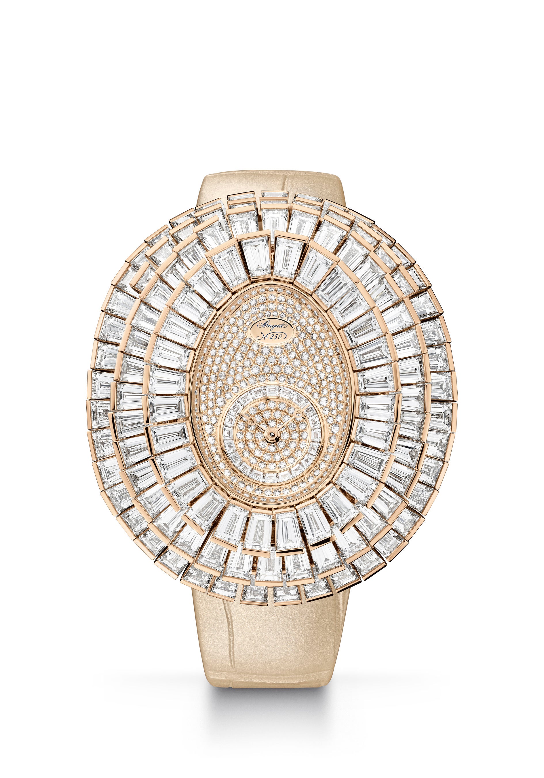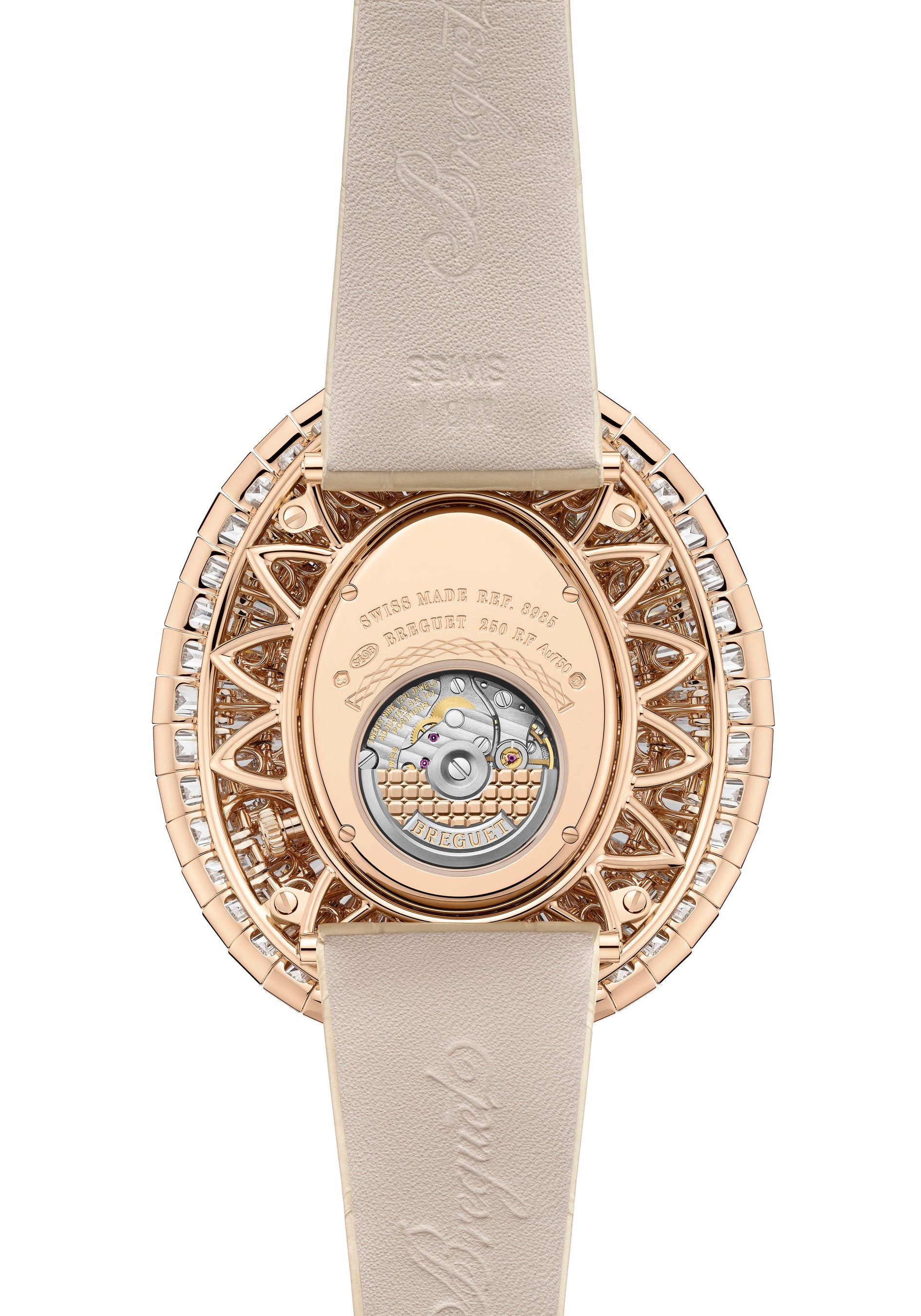 受注で製作されるこの時計は、それぞれサテン調の加工を施したシャンパンカラーのアリゲーターレザーストラップを組み合せ、28個のダイヤモンドを配したブレゲ三つ折りデプロワイヤントバックルが付属します。「レーヌ・ドゥ・ナープル クレイジー・フラワー」に用いられたダイヤモンドは、全部で436個、計37.2カラットにのぼります。