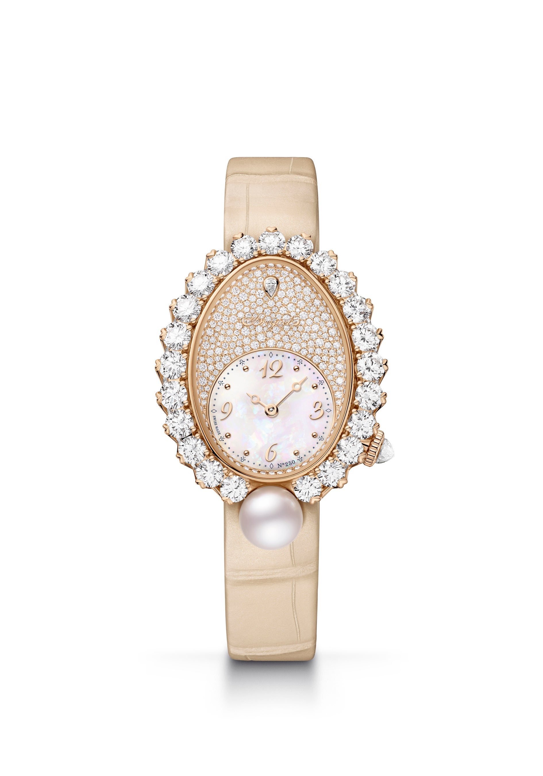 「レーヌ・ドゥ・ナープル ペルル・アンぺリアル」の場合は、素材の構成でアコヤパールに焦点が置かれています。最も貴重とされるアコヤパールには完全に滑らかな表面や丸い形、虹彩が備わり、19世紀末から日本で養殖されてきたそのパールが、このタイムピースの中心に輝いています。