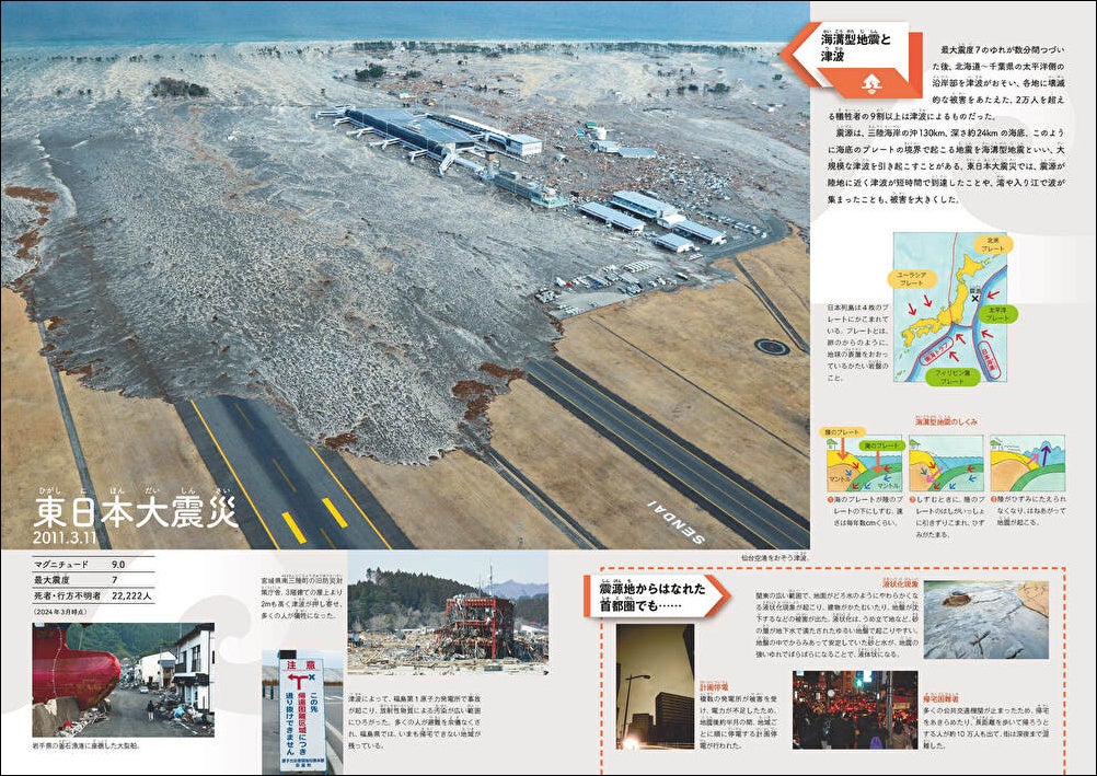 過去の災害についてイメージしづらい子どもたちに向けて、それぞれの災害でなにが起きたのかわかるよう、冒頭に口絵を新設しました。1995年の阪神・淡路大震災、2011年の東日本大震災、2018年の西日本豪雨などについて、災害が起こった仕組みとともに紹介しています。