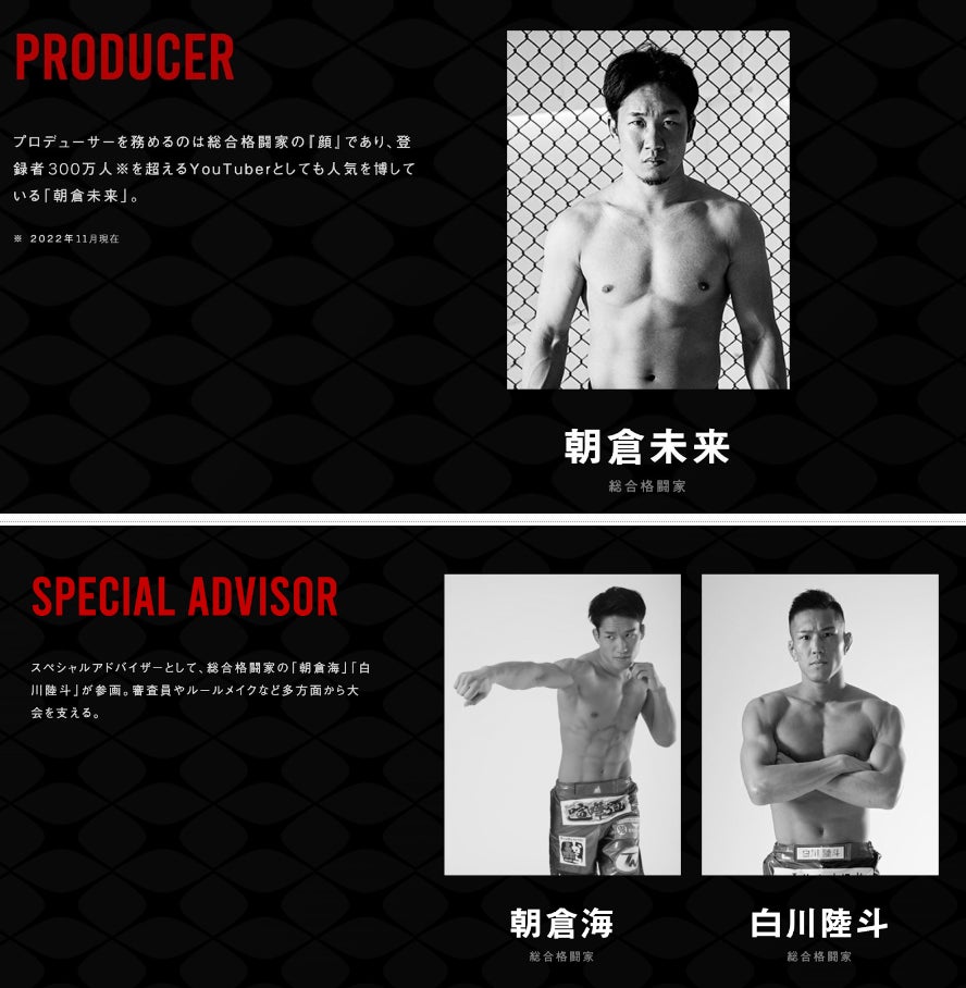 同大会はYUGOが総合プロデュースを、そして登録者数300万人超え(2022年11月現在)の人気YouTuberでもある総合格闘家の朝倉未来がプロデューサーを務め、スペシャルアドバイザーとして総合格闘家の朝倉海、総合格闘家の白川陸斗が参画しています。