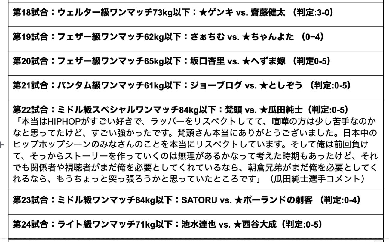 ■今大会の「ファイト オブ ザ・ナイト」に選ばれたのが、「アウトローのカリスマ 瓜田純士」選手と「岐阜の暴君ラッパー 梵頭」選手の一戦です。オーディションでできた因縁を果たすべく、バン中村との一戦を反故にしてまで決まった試合でした。瓜田選手の猛攻撃に一切下がらない梵頭選手。後半の追い上げもあり30秒の延長戦になりました。