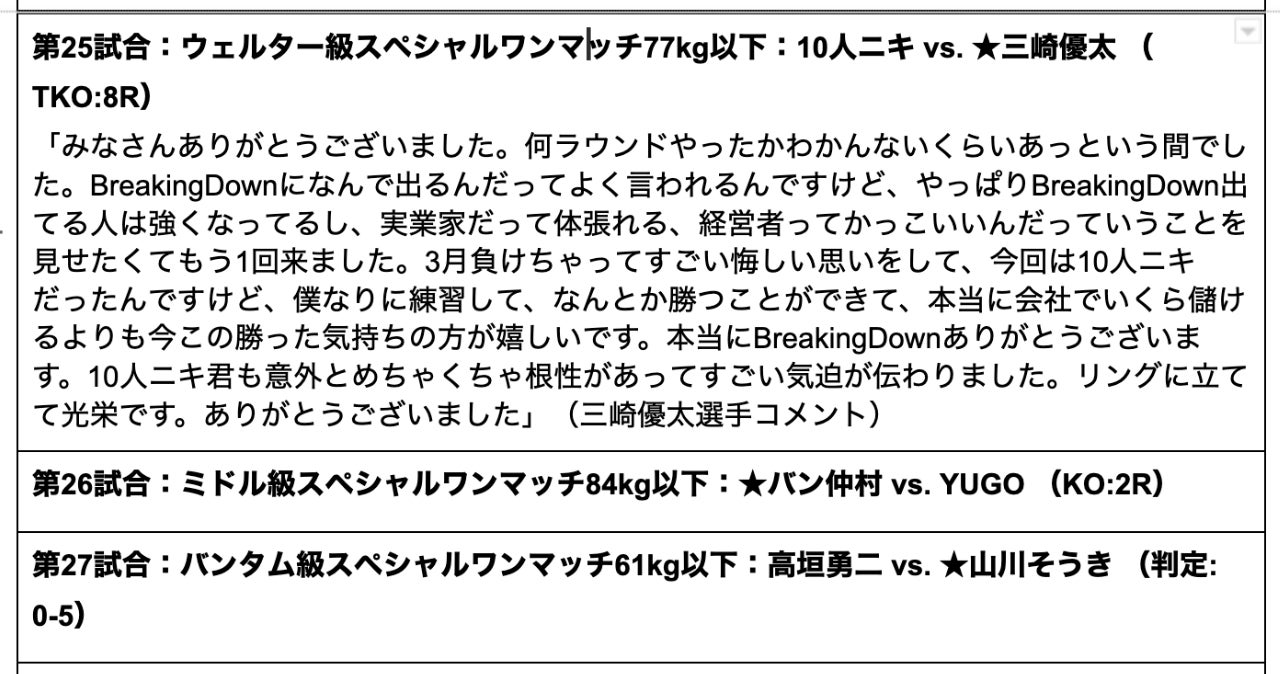 BreakingDown CEOのYUGOは「とても見応えのある試合が多く、BreakingDownで人生が変わったと言ってくれる選手がいることは大変嬉しく思っています」と語っています。