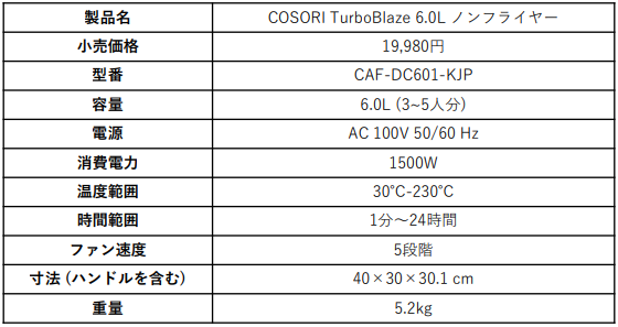 製品ページURL:https://vesync.jp/products/cosori-turbo-blaze-6l-air-fryer