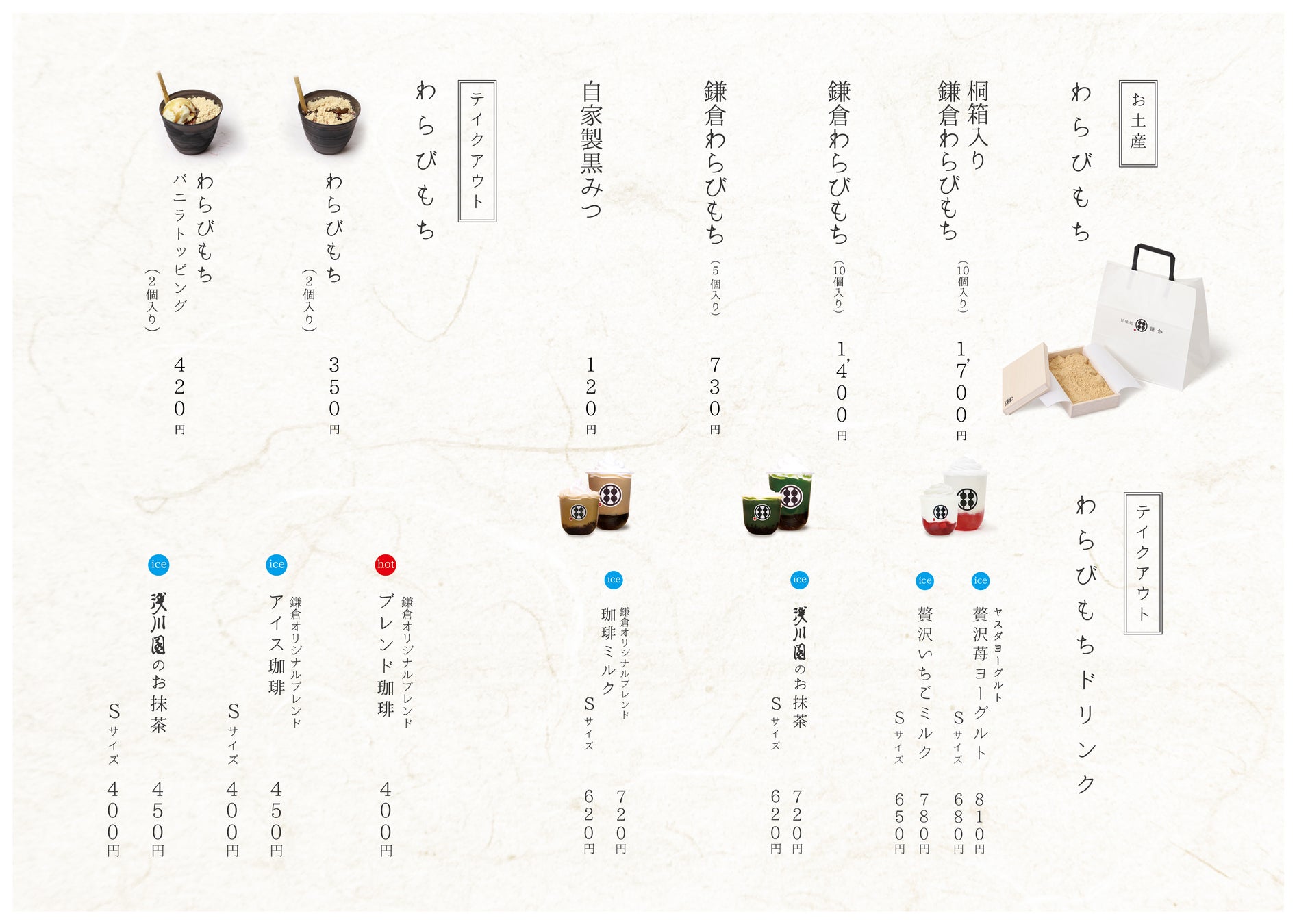 このわらびもちをその食感、旨味を凝縮し、そのままドリンクに仕立て上げた、老若男女、世代を問わず愛され続ける『鎌倉わらびもちドリンク』は、様々なフレーバーをお楽しみいただけます。