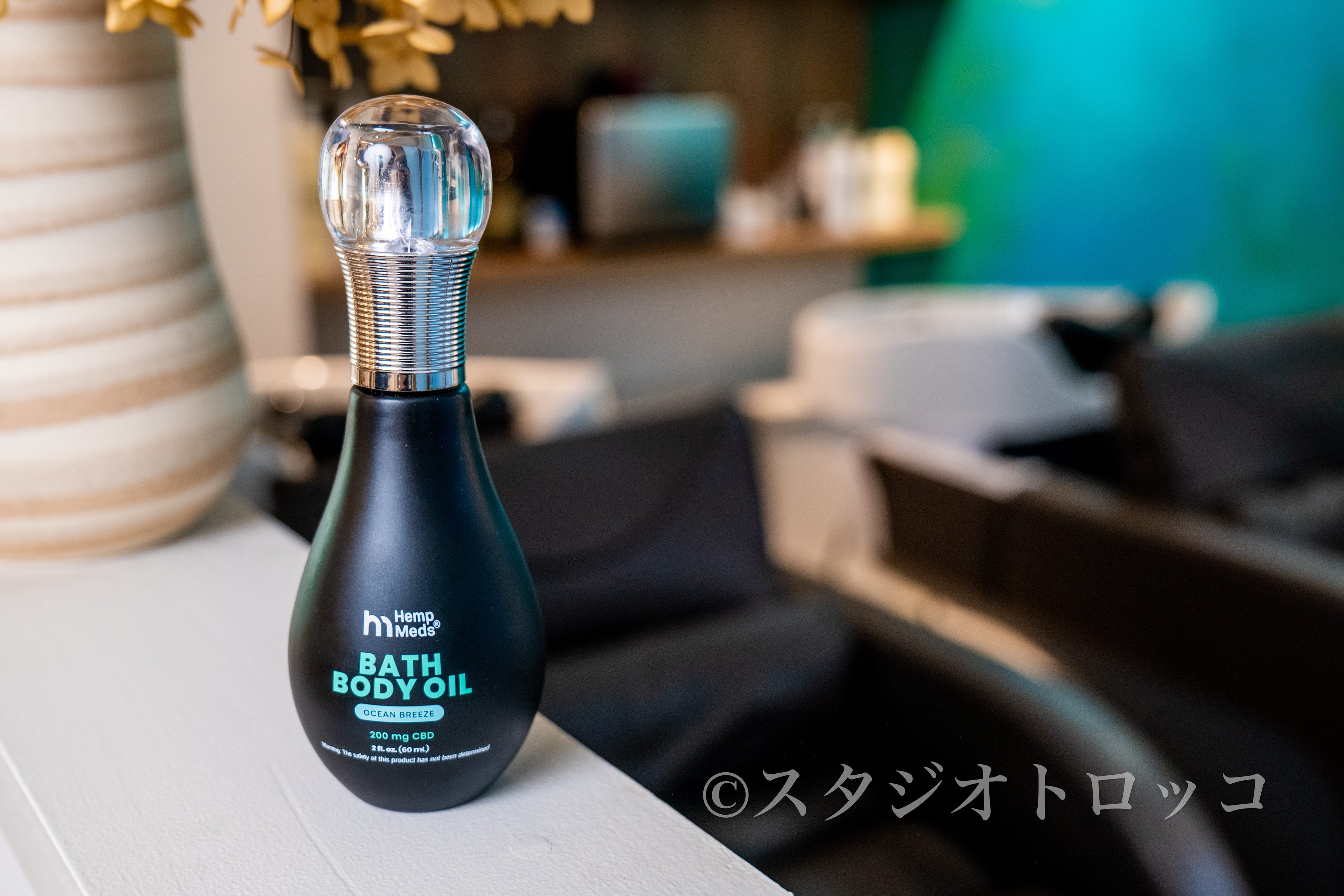 2.シャンプーブースでHempMedsのBath Body Oilを頭皮に塗布しヘッドマッサージ