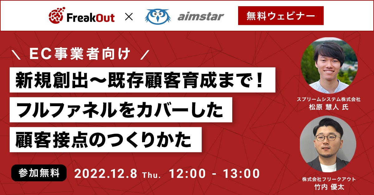 スプリームシステム株式会社(本社:東京都豊島区、代表取締役社長兼CEO:渡部 知博)は、2022年12月8日(木) 12時から株式会社フリークアウトと共同で、「【EC事業者向け】新規創出~既存顧客育成まで!フルファネルをカバーした顧客接点のつくりかた」と題した無料オンラインセミナーを開催いたします。