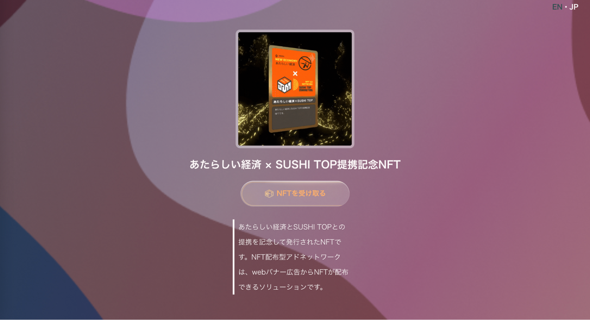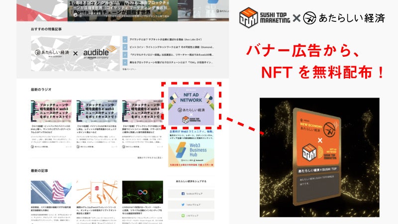 SUSHI TOP MARKETINGの提供する「NFT配布型アドネットワーク」機能を「あたらしい経済」内のTOPページや各記事を組み込み、広告接触者が表示されたバナーをクリックすることで、リンク先の専用ページでNFTを無償で獲得可能な、バナー広告とNFT配布を掛け合わせた広告プランをローンチいたしました。