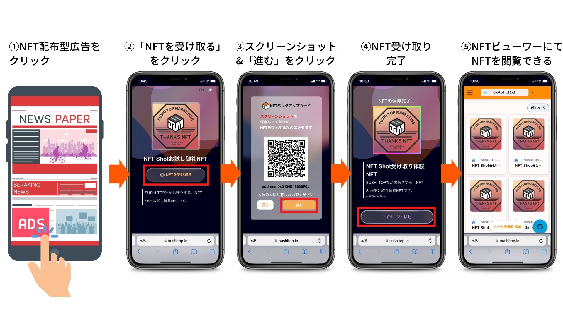 SUSHI TOP MARKETINGの特許出願中技術により、ウォレットの事前準備が必要ないことから、誰でも簡単かつ迅速にNFTを受け取ることができます。