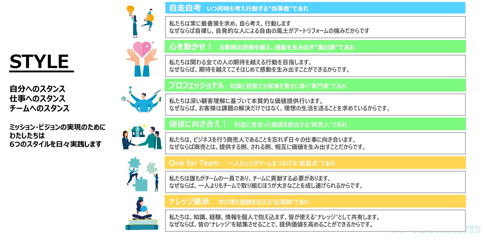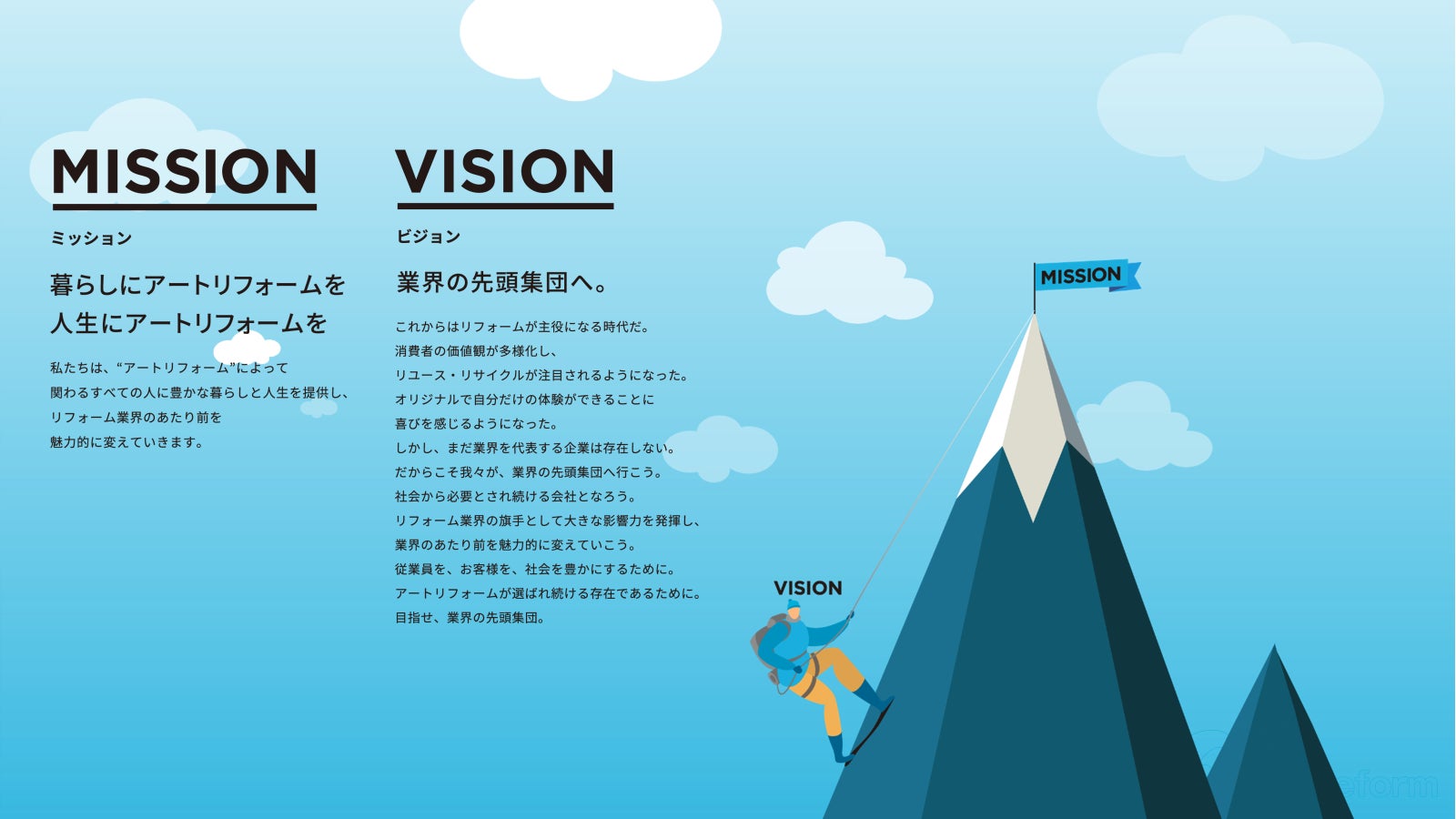 企業ミッション「暮らしにアートリフォームを人生にアートリフォームを」には、リフォーム業界そのものやリフォームサービスをもっと魅力的なものに変えていく、業界の当たり前を変え社会全体の住環境のあり方を前進させていくという想いを込めています。業界を魅力的に変えていくための手段の一つとして、「センリョク」という業界団体に参画し、出資・運営を行っています。また、ミッションの実現に向けて、「業界の先頭集団へ」というビジョンを掲げており、我々が業界の先頭集団のペースメーカーとして業界を牽引・変革していくことを目標にしています。