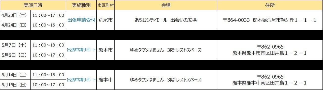 ※開催場所の調整状況や新型コロナウィルスの感染状況等により、「出張申請受付」及び「出張申請サポート」の開催を中止・延期、または実施内容が変更となる可能性がございます。