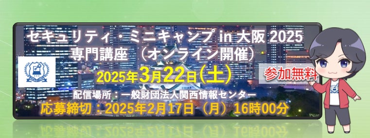 2025年3月22日(土)一般財団法人関西情報センター(KIIS)、一般社団法人セュリティ・キャンプ協議会、独立行政法人情報処理推進機構(IPA)が主催する「セキュリティ・ミニキャンプ in 大阪 2025」の専門講座(オンライン)への参加者を募集いたします。