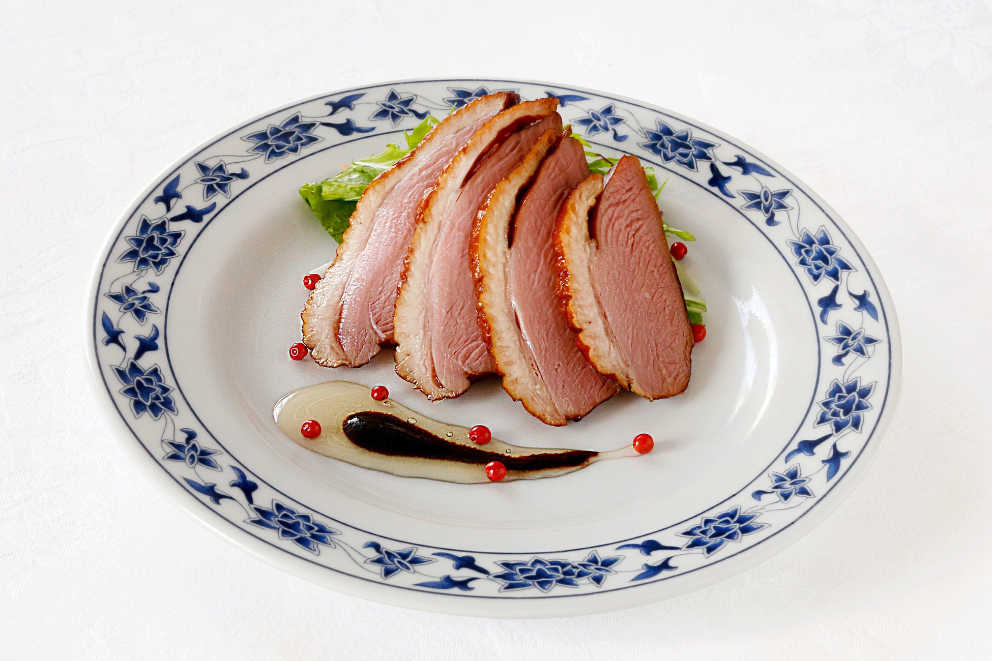 しっかりとスモークをかけた鴨肉の燻製。四川料理のスモークダックをワインと合わせてお楽しみいただく一皿です。ソースにはちみつやピンクペッパー、山椒を使い、一味違ったスモークダックに仕上げました。