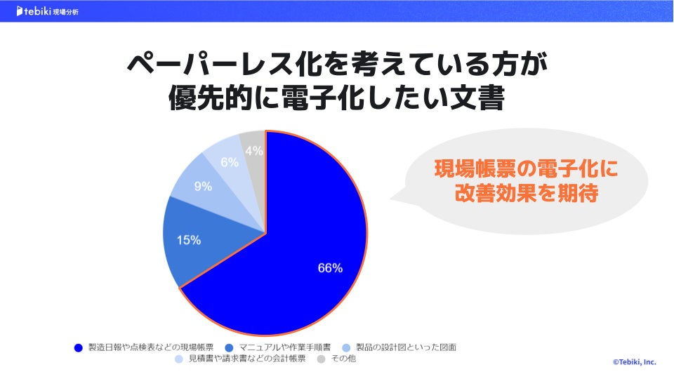 Tebiki株式会社(本社:東京都新宿区、代表取締役:貴山敬 / 以下、Tebiki)が運営するWebメディア「現場改善ラボ」において、製造業に従事する方を対象に「ペーパーレス化推進状況の実態調査」を実施しました。