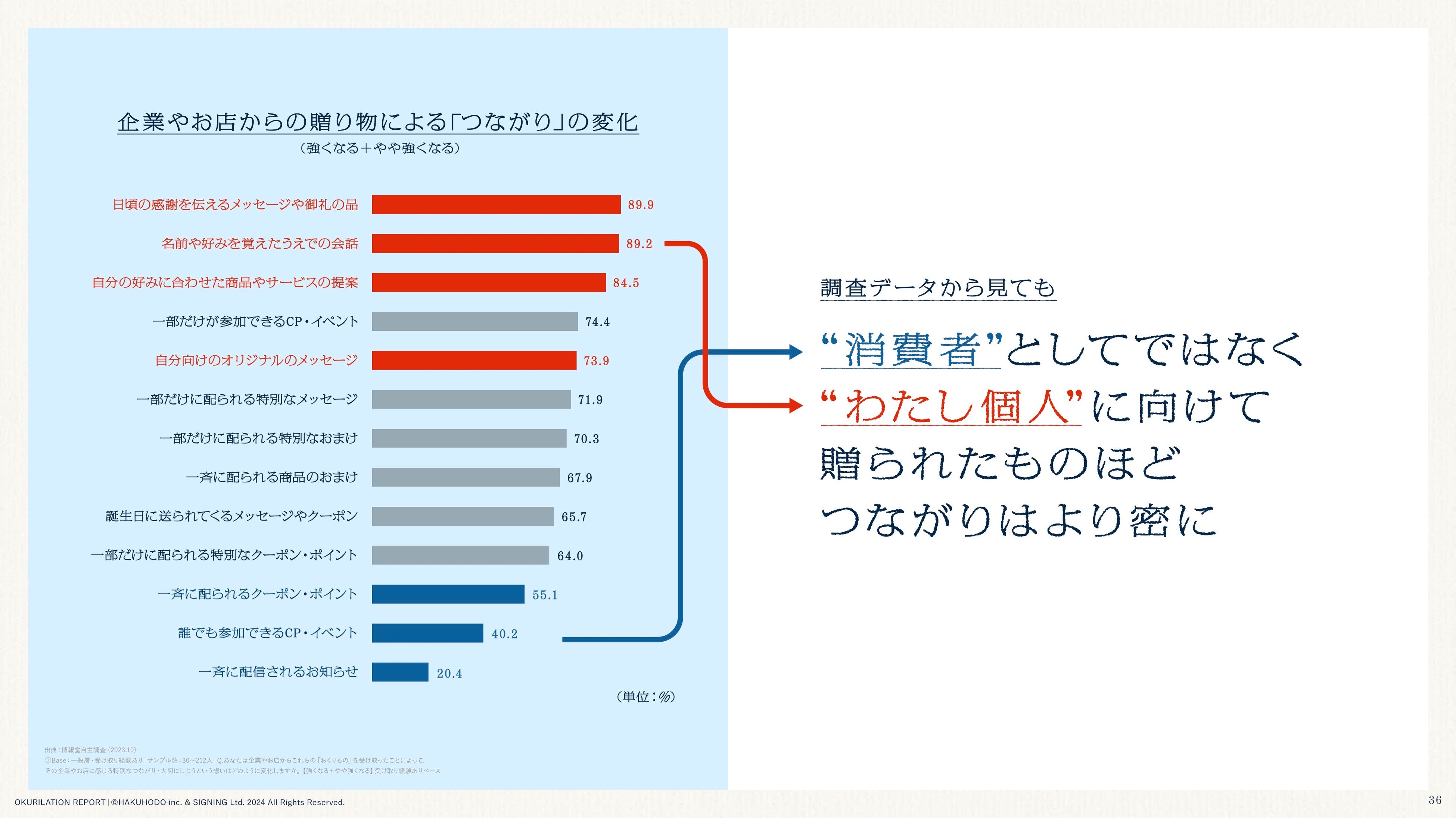 本プロジェクトでは、「贈ること」に関する実態や生まれる関係性の変化などを把握することを目的として、全国の 10代〜70代の男女を対象にした Web定量調査を行ったほか、有識者へのインタビューなどを通して「贈与」「オクリレーション」について考察・提言しています。