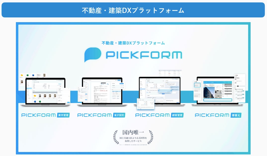 株式会社PICKは、「不動産取引を快適に、オープンに」をミッションに、不動産・建築業界のバリューチェーンが抱える構造的な課題に対し、2022年の「PICKFORM 電子契約」をリリース以来、不動産/建築の取引における「顧客体験の向上」を目指しています。 「PICKFORM 電子契約」では国内で唯一国土交通大臣より正式回答をもらい、新しい法律に対しても安心して”適法に”利用いただけるサービスとして、導入企業が増えております。 今後は、今回の「PICKFORM 顧客管理」をはじめとして、不動産/建築業者の皆様の業務を1つでも多く解決するべく、年内に続けてサービスのリリースを予定しています。PICKFORMは不動産・建築特化の Verticalオールインワン SaaS『PICKFORM』として業界に貢献できるよう進化していきます。