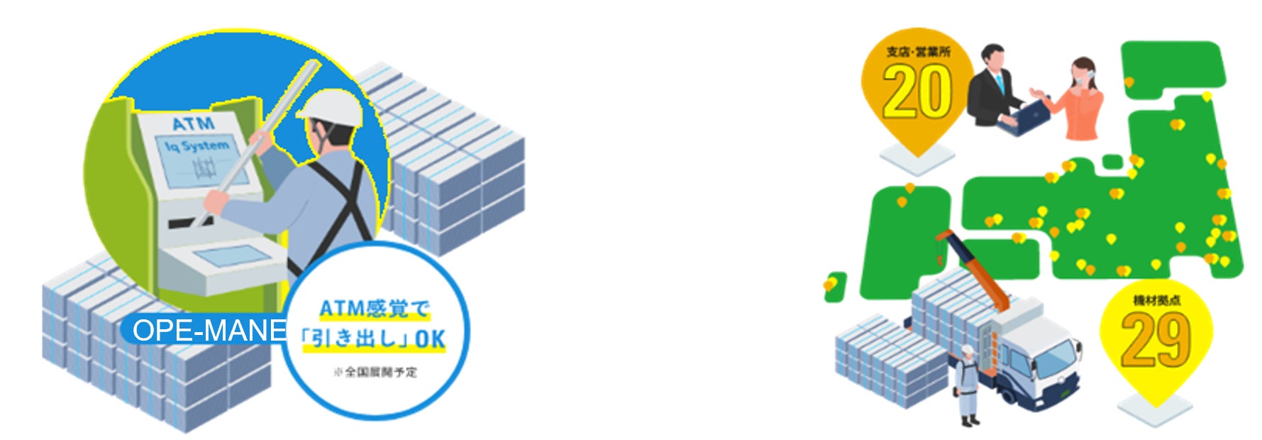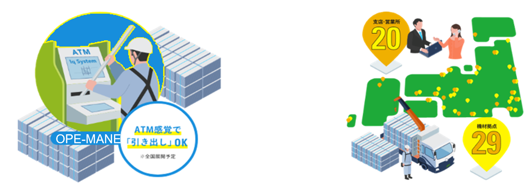 『Takamiya Platform』を利用する顧客は、保有するIqシステムを全国29箇所にある機材Base(供給拠点)に保管することが可能になり、コスト削減・ビジネスチャンス拡大などが見込めます。購入場所問わずATMのような感覚で、全国の機材Baseから足場機材を引き出して利用することが可能になります。また、機材の管理・整備は当社が徹底して行うため、製品の品質は保証されます。